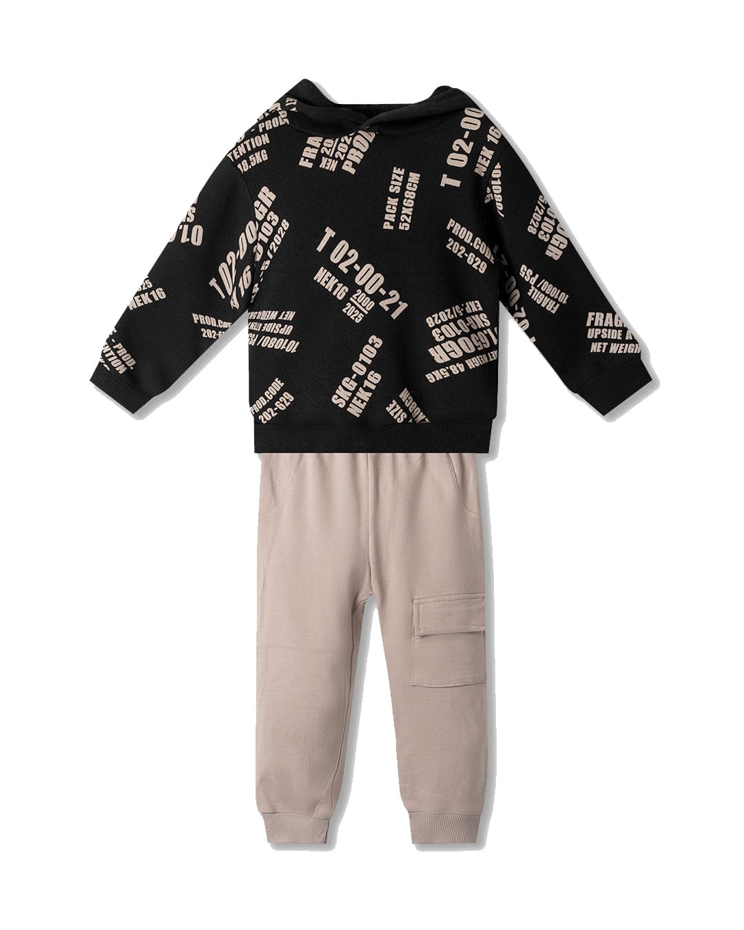 Παιδικό σετ φόρμας fleece μαύρο-μπεζ με γραμματάκια και κουκούλα