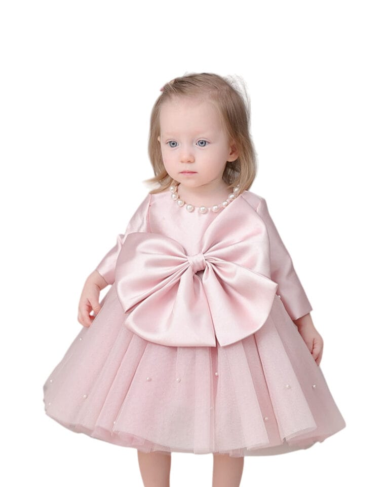 Παιδικό φόρεμα ροζ κουφετί minimal chic με μεγάλο φιόγκο μπροστά και πέρλες