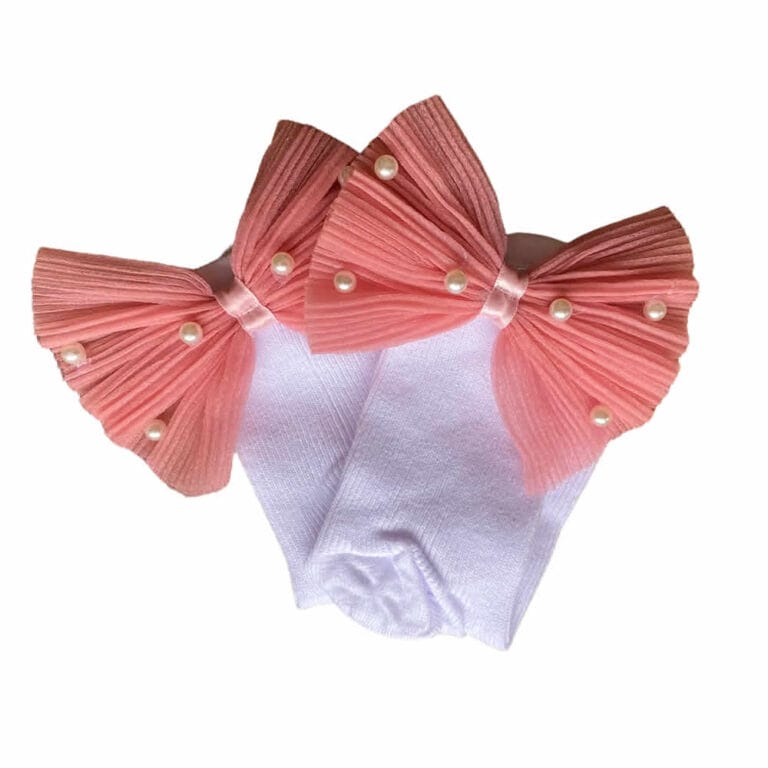 Κάλτσες λευκές με εντυπωσιακό ροδακινί πλισέ φιόγκο και πέρλες