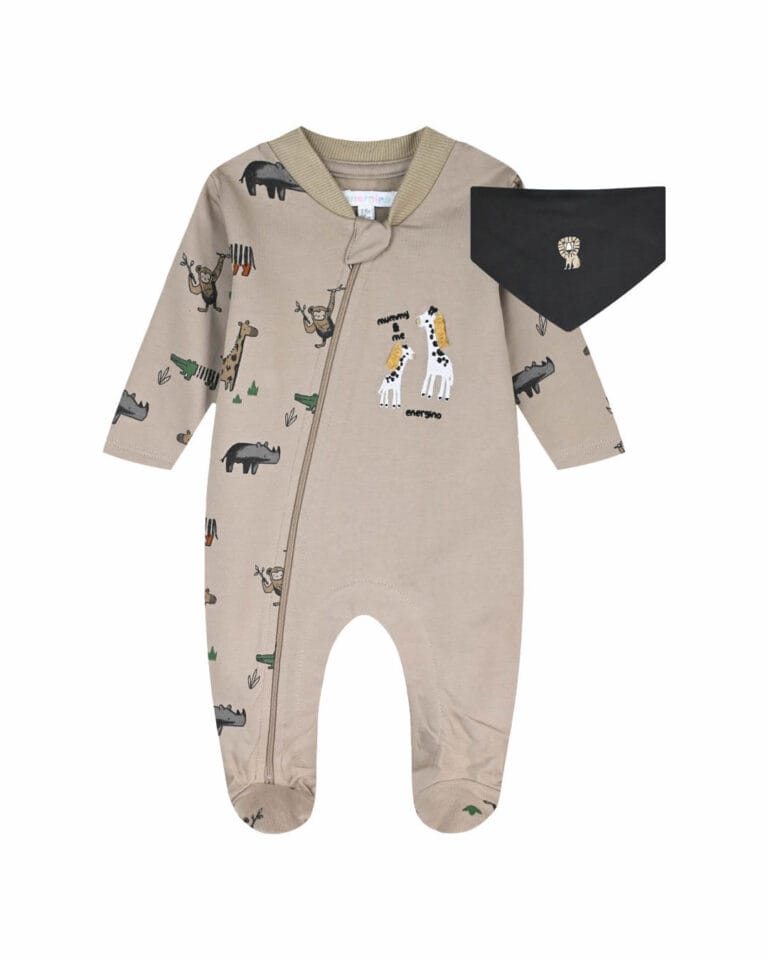 Βρεφικό φορμάκι fleece μπεζ με σαλιάρα διπλής όψης Ζωάκια