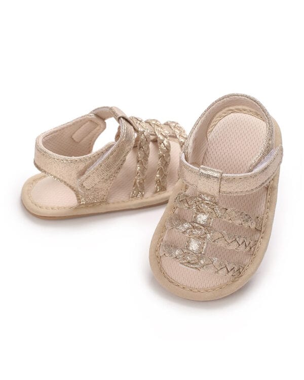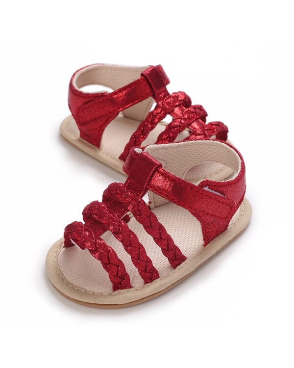 Πέδιλα αγκαλιάς μαύρα μεταλιζέ με λουράκια πλεξούδα και δέσιμο χρατς. Σόλα από καουτσούκ, ιδανικά ακόμη και για τα πρώτα βήματα.