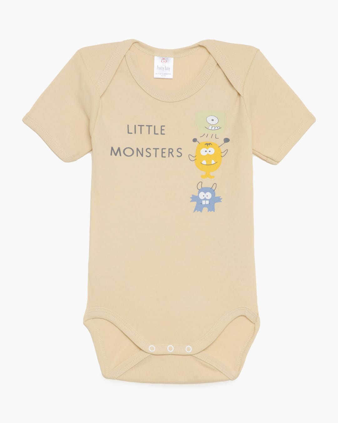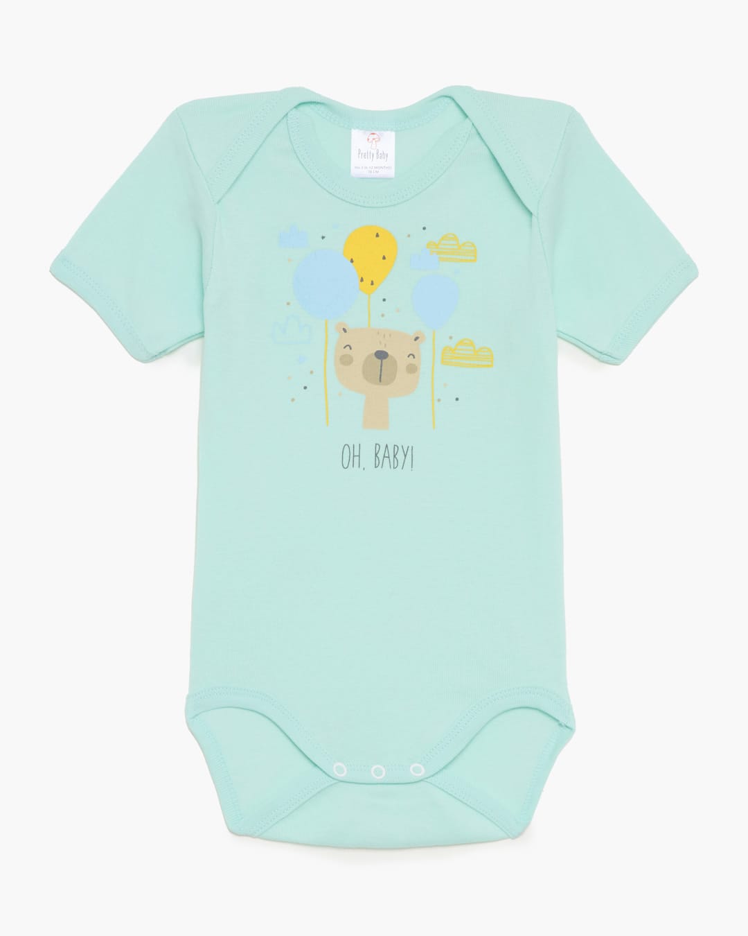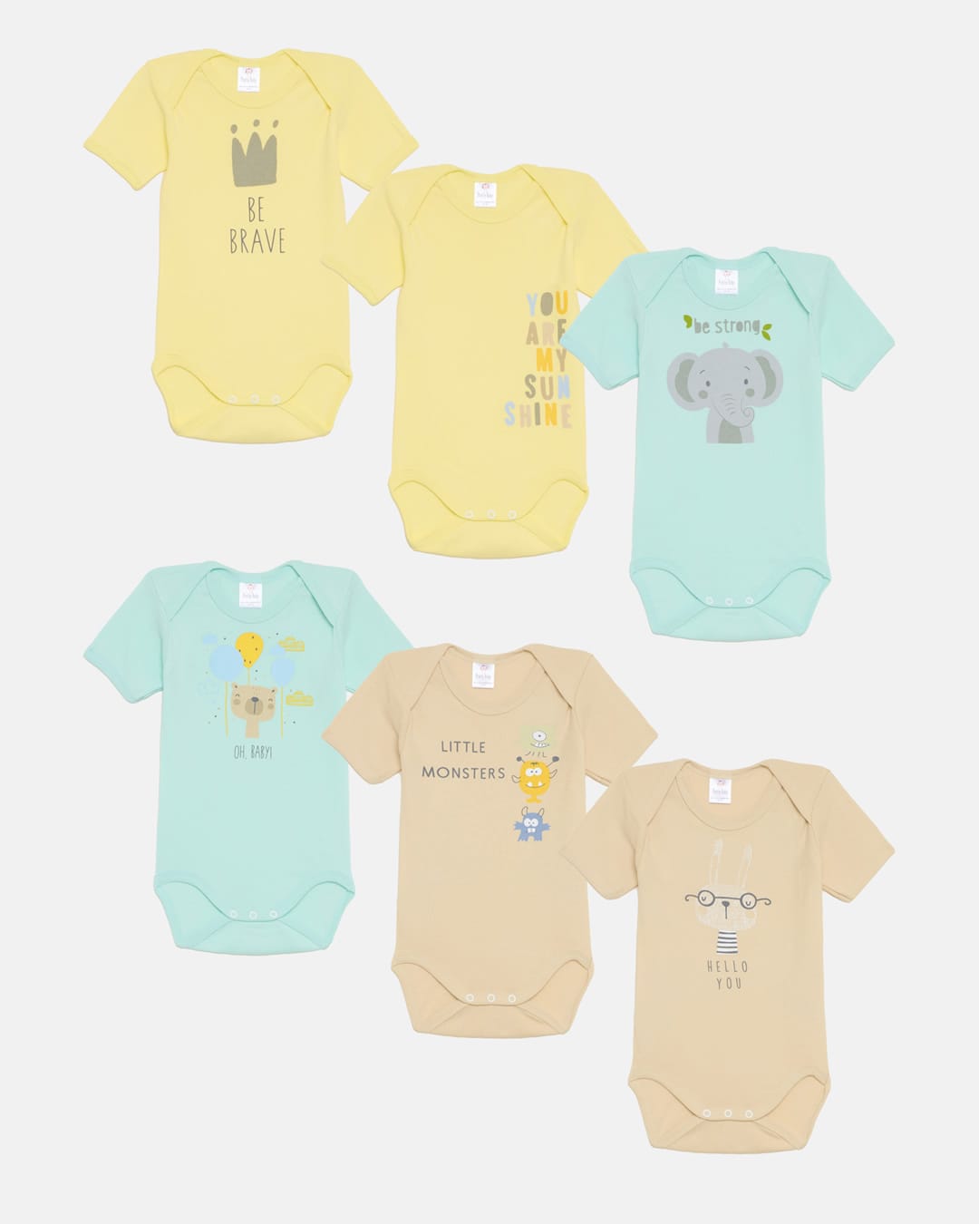 Βρεφικά κορμάκια κοντομάνικα σε τιρκουάζ, μπεζ, κίτρινες αποχρώσεις με διάφορα σχέδια.