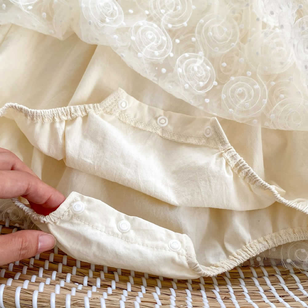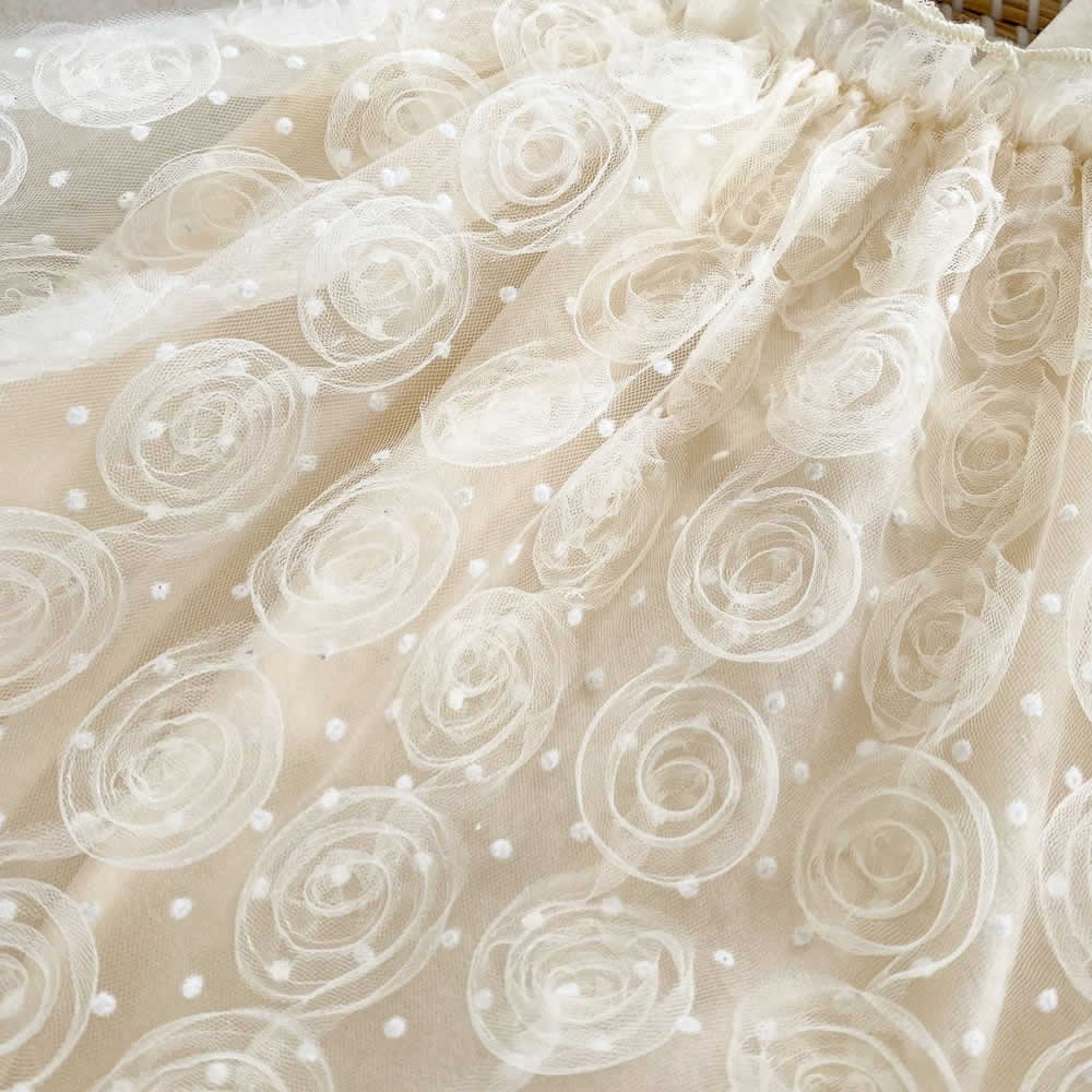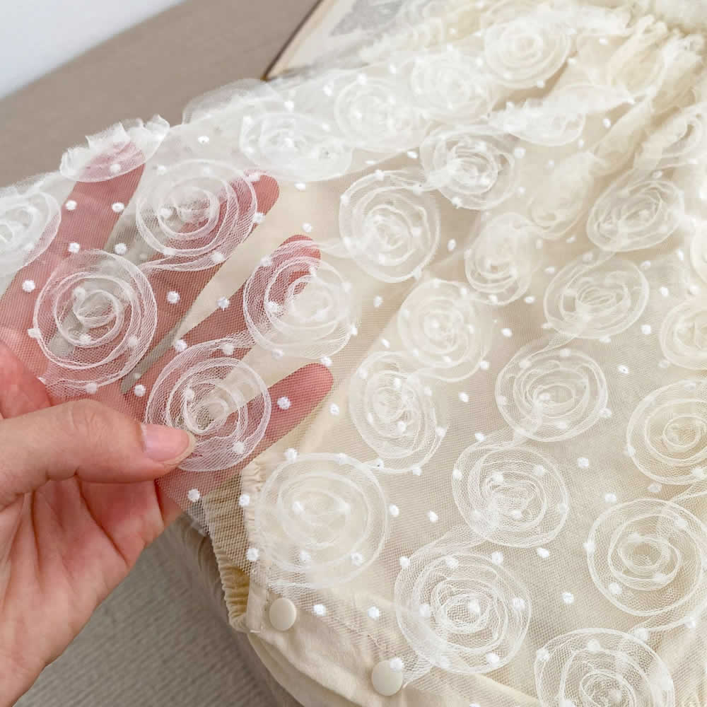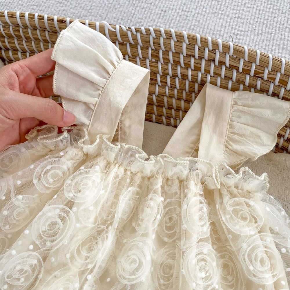 Βρεφικό κορμάκι για κορίτσι εκρού με τιραντούλες, τούλινο πουά με ανάγλυφα τριανταφυλλάκια.