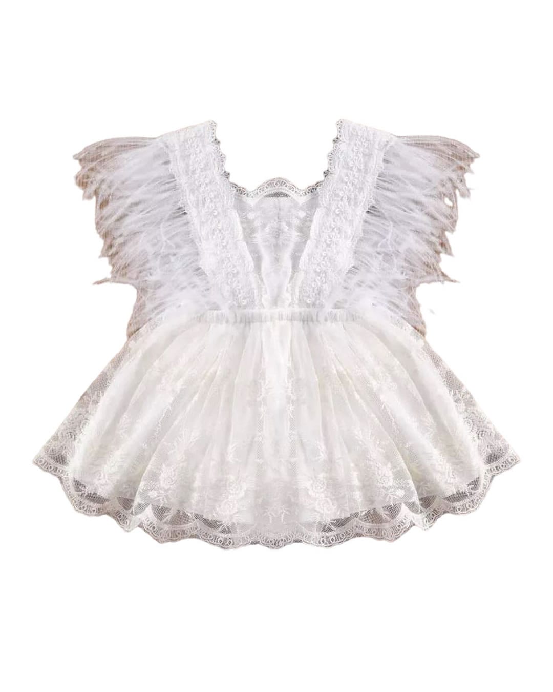 Βρεφικό κορμάκι για κορίτσι λευκό με δαντέλα και πούπουλα στους ώμους.