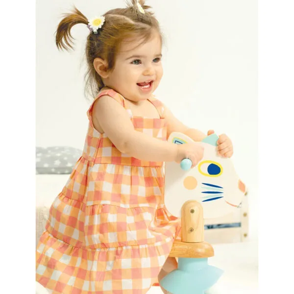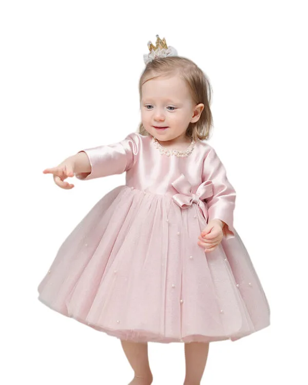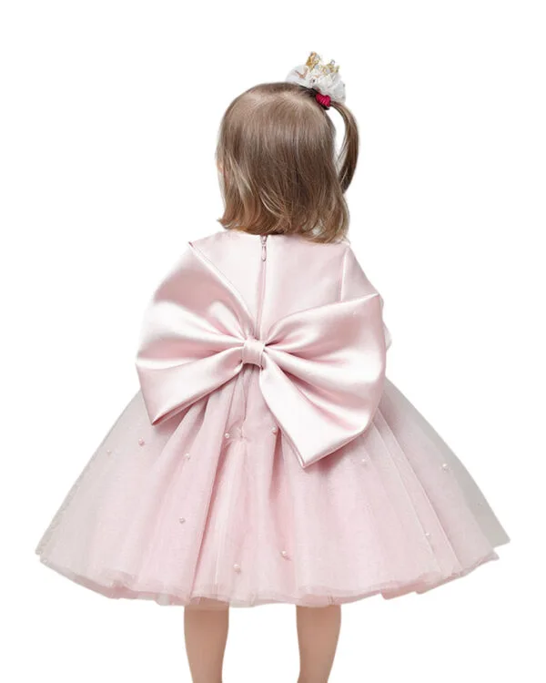 Παιδικό φόρεμα ροζ κουφετί minimal chic με μεγάλο φιόγκο πίσω και πέρλες