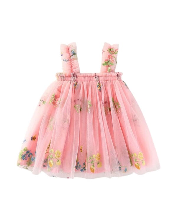 Παιδικό φόρεμα ροζ τούλινο με κεντημένα λουλουδάκια