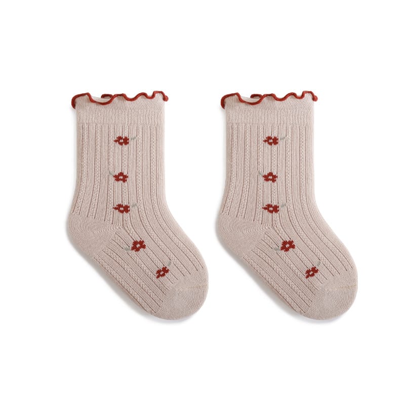 Κάλτσες ημίψηλες λεπτές μπεζ με καφέ λουλούδια και βολάν στο λάστιχο