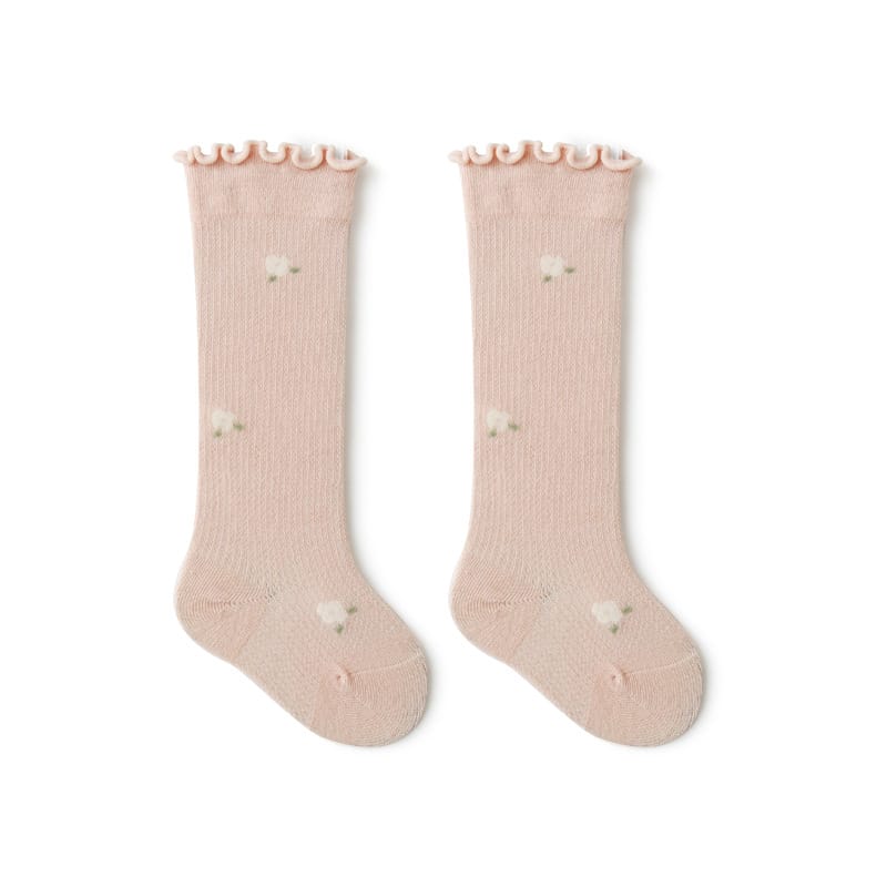 Κάλτσες ψηλές λεπτές σομόν με λευκά λουλούδια και βολάν στο λάστιχο