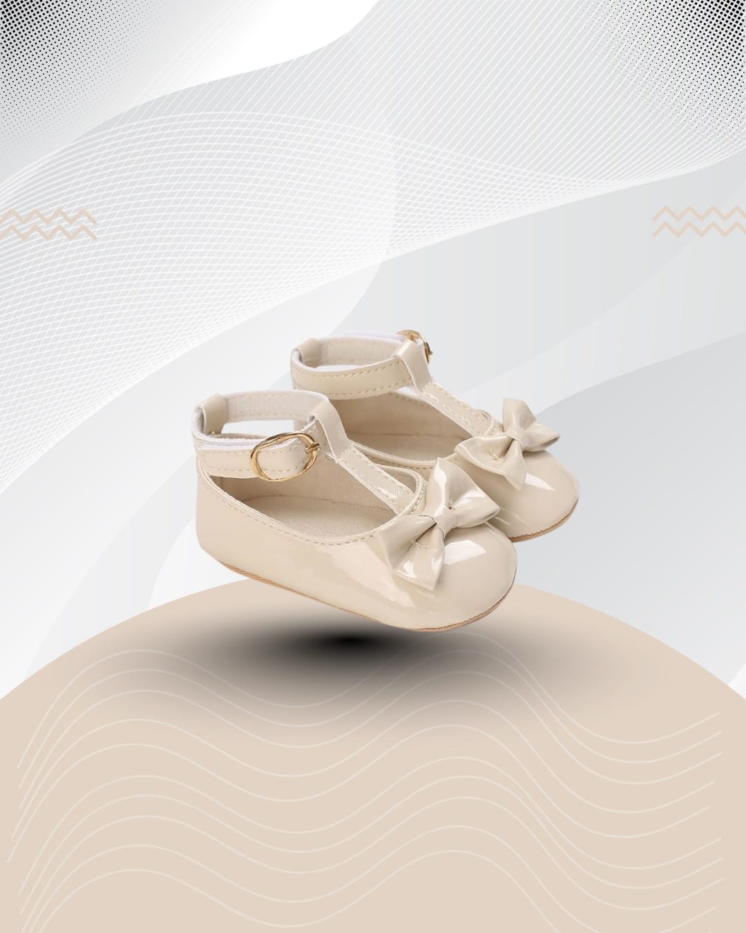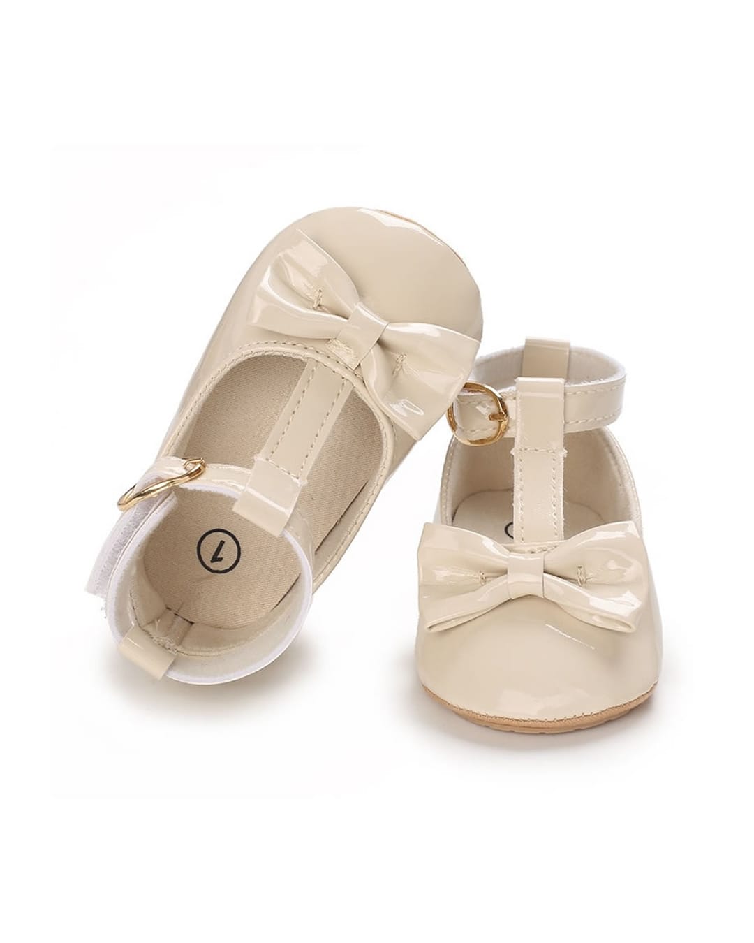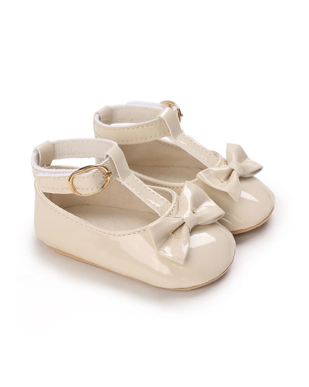 Μπαλαρίνες αγκαλιάς εκρού από λουστρίνι με μπαρέτα και φιόγκο και σόλα από μαλακό καουτσούκ, ιδανικές ακόμη και για τα πρώτα βήματα.