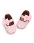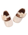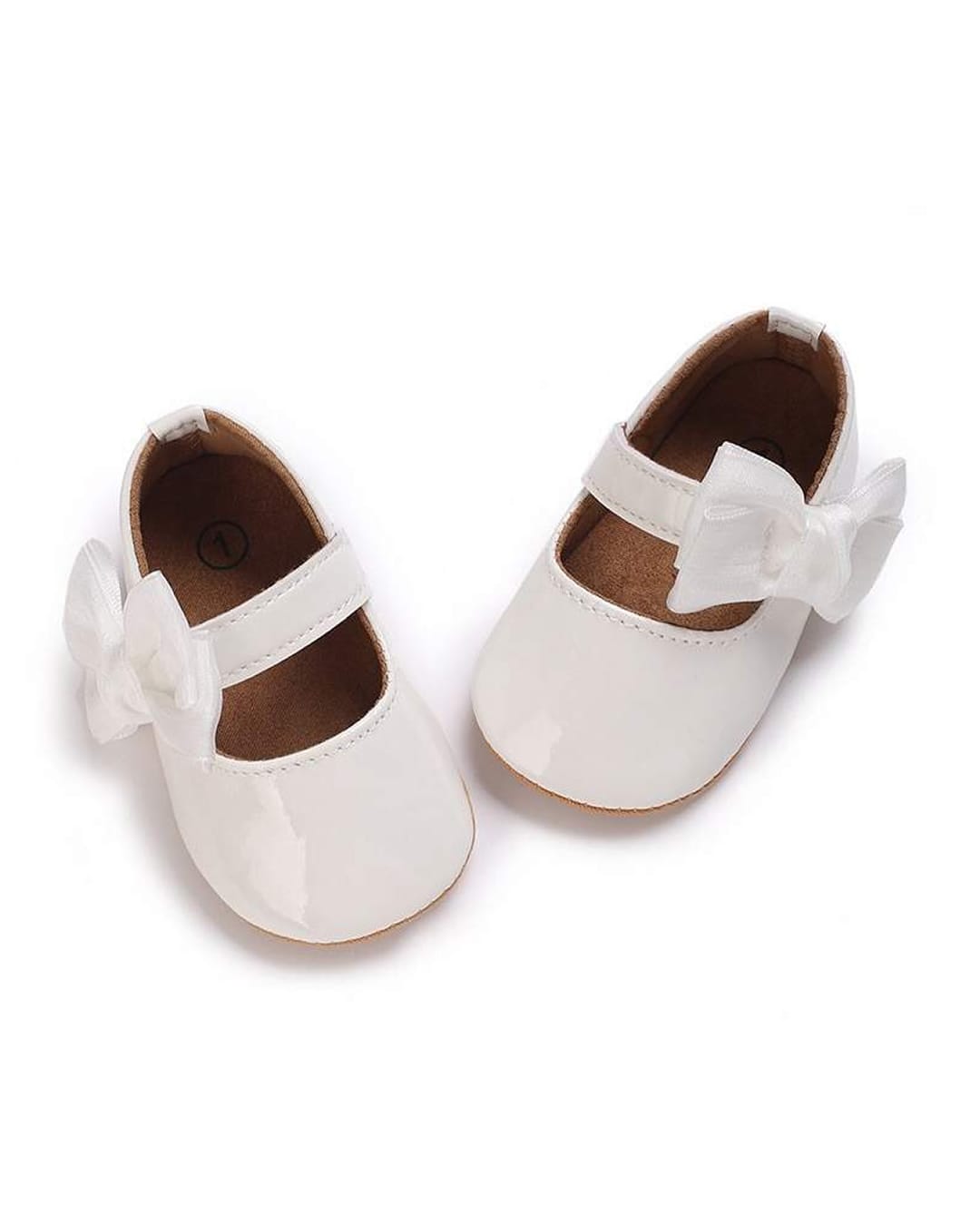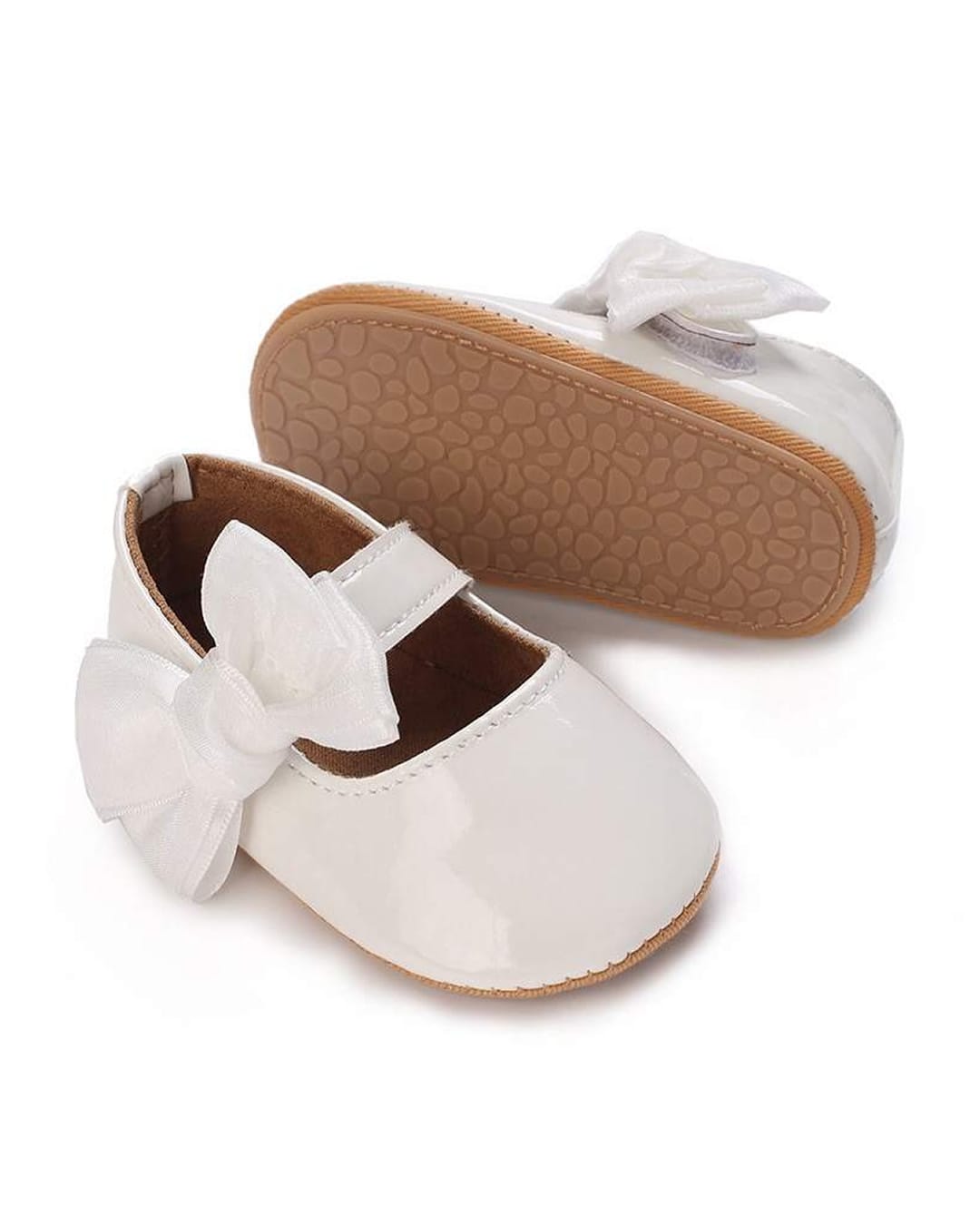 Μπαλαρίνες βρεφικές από λουστρίνι με σατέν φιόγκο λευκές και κούμπωμα χρατς. Διαθέτει μαλακή σόλα ιδανική για τα πρώτα βήματα.