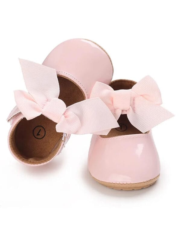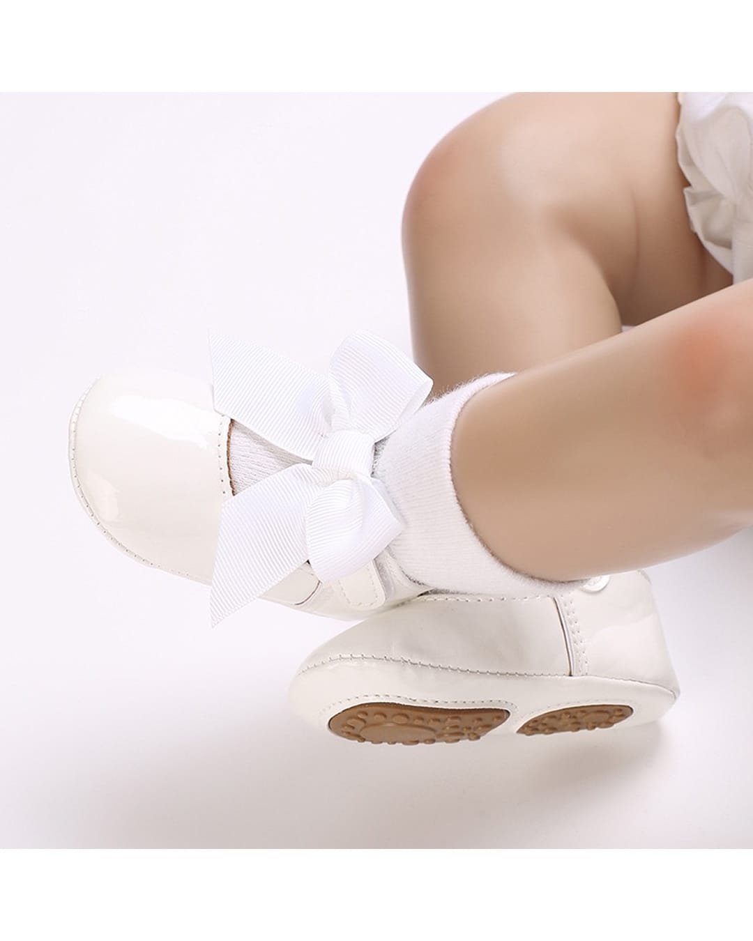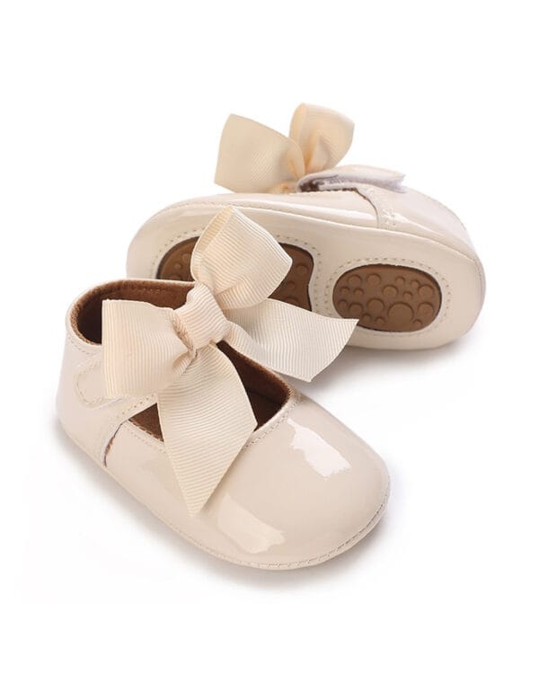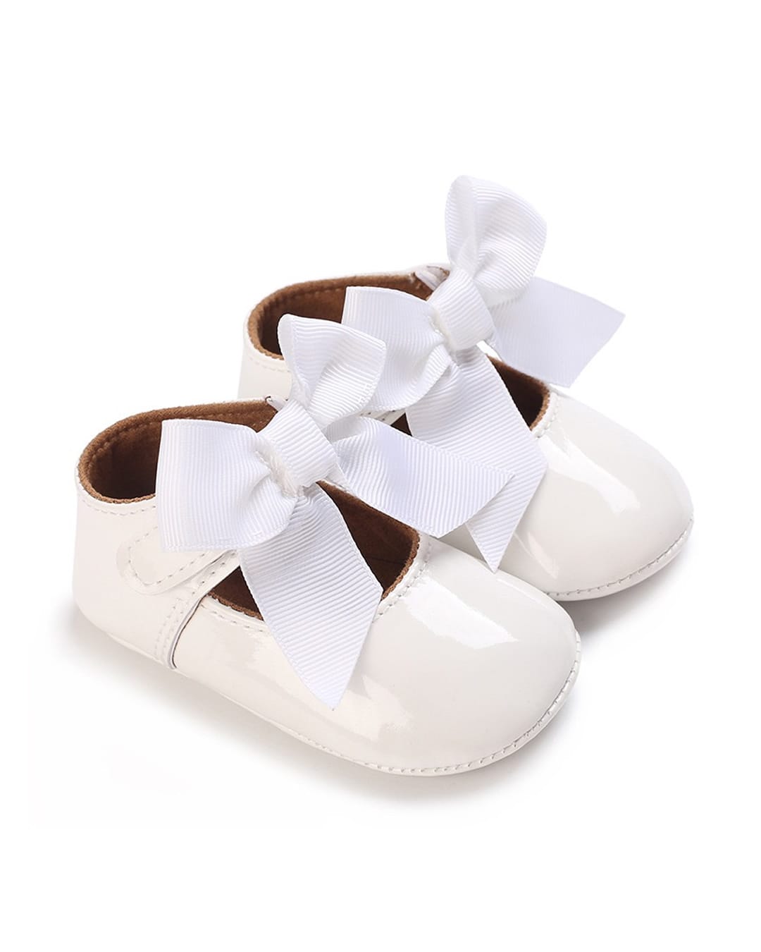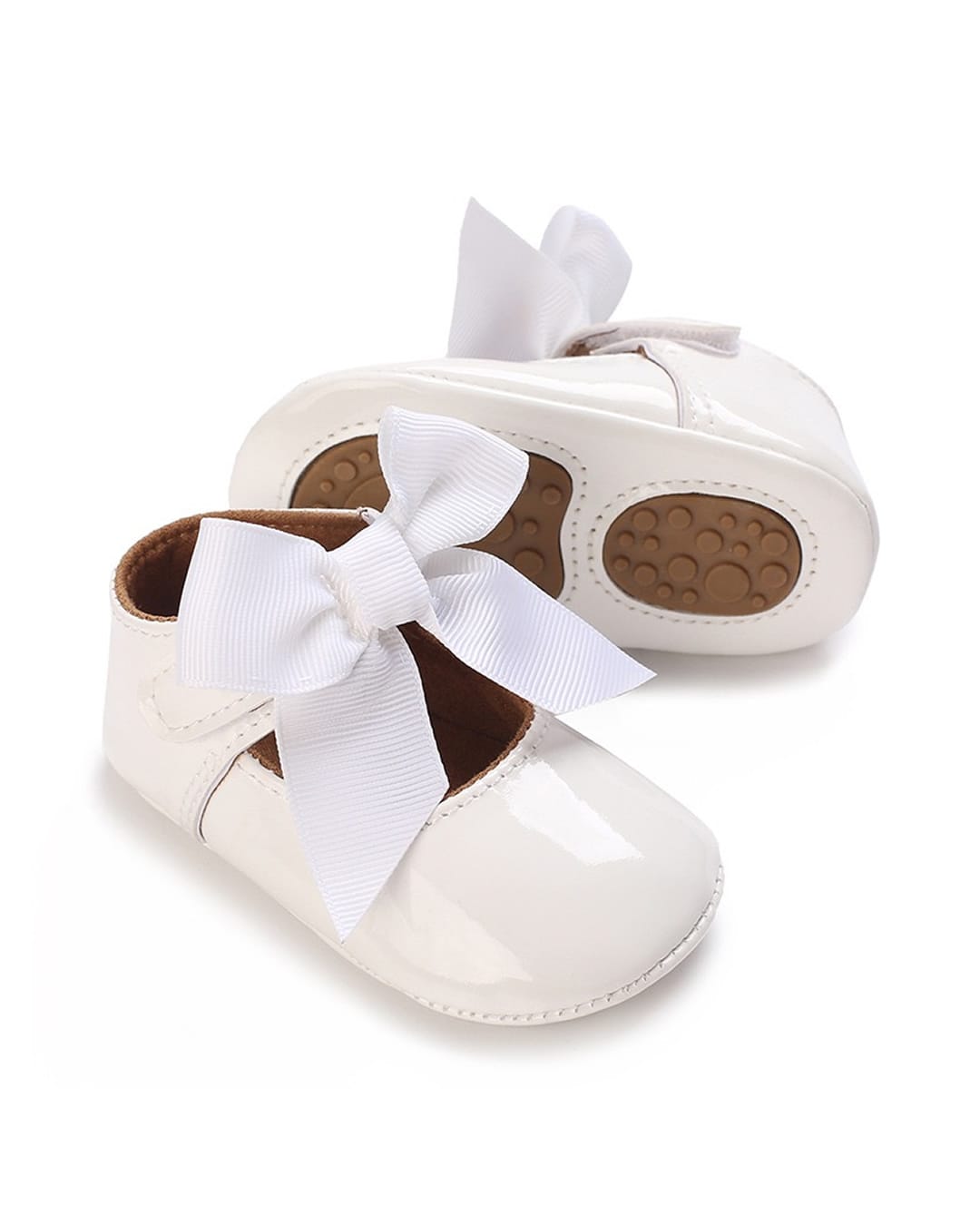 Βρεφικές μπαλαρίνες αγκαλιάς λευκές από λουστρίνι με μπαρέτα με φιόγκο από γκρο κορδέλα και μαλακά σημεία από καουτσούκ στον πάτο.