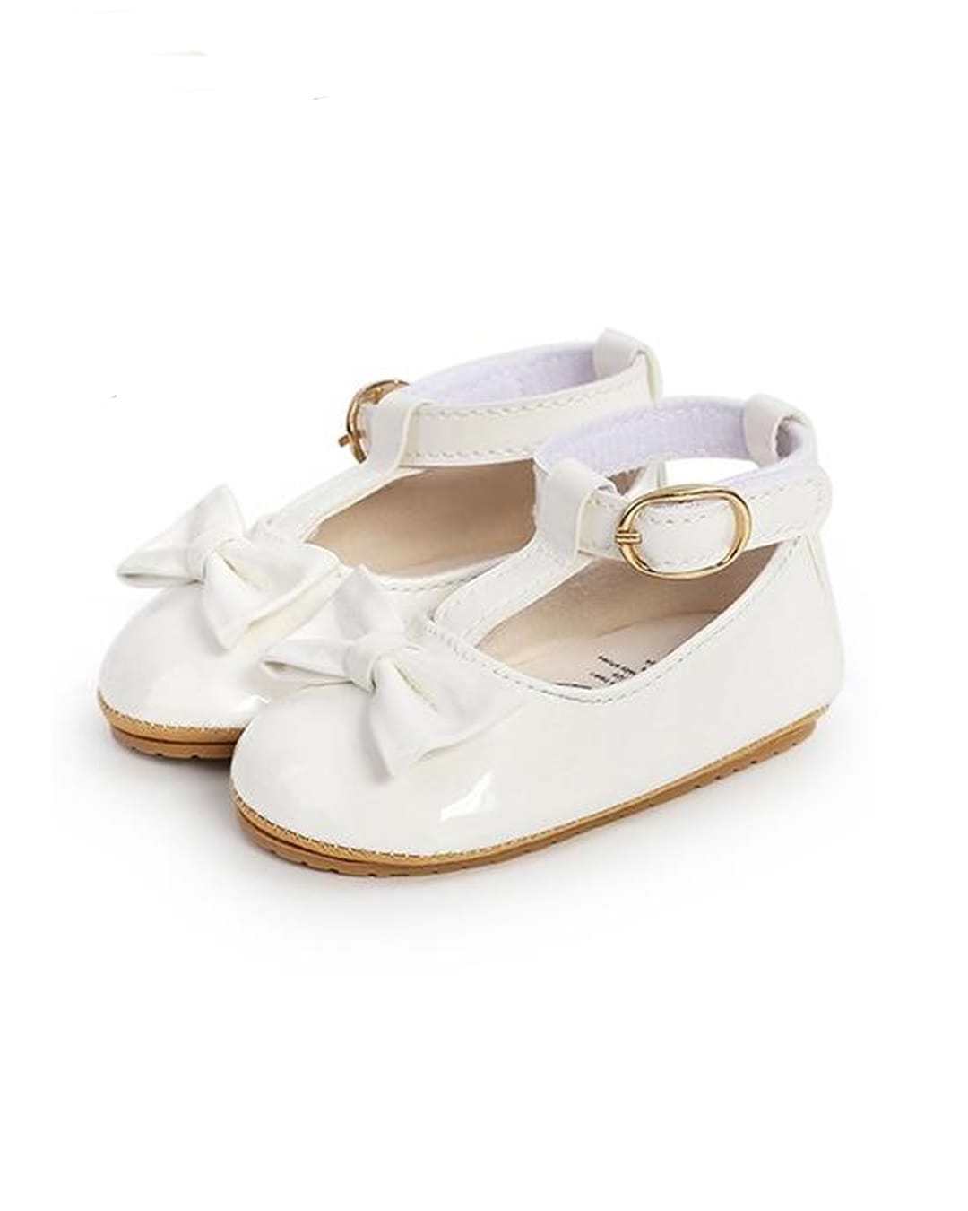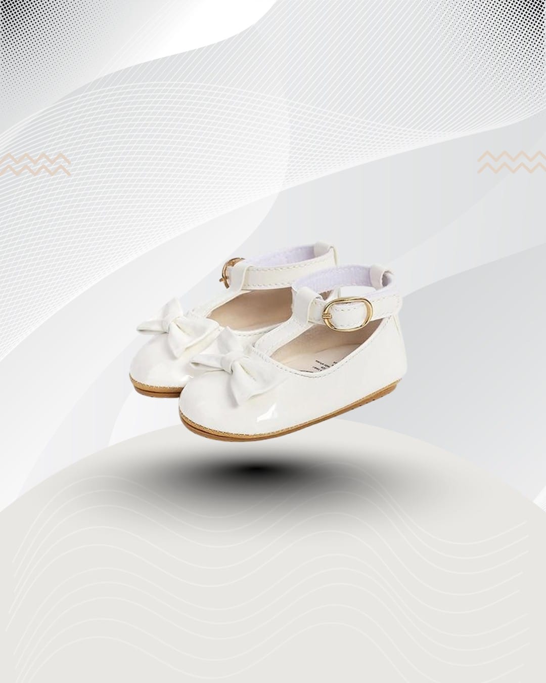 Μπαλαρίνες αγκαλιάς λευκές από λουστρίνι με μπαρέτα και φιόγκο και σόλα από μαλακό καουτσούκ, ιδανικές ακόμη και για τα πρώτα βήματα.