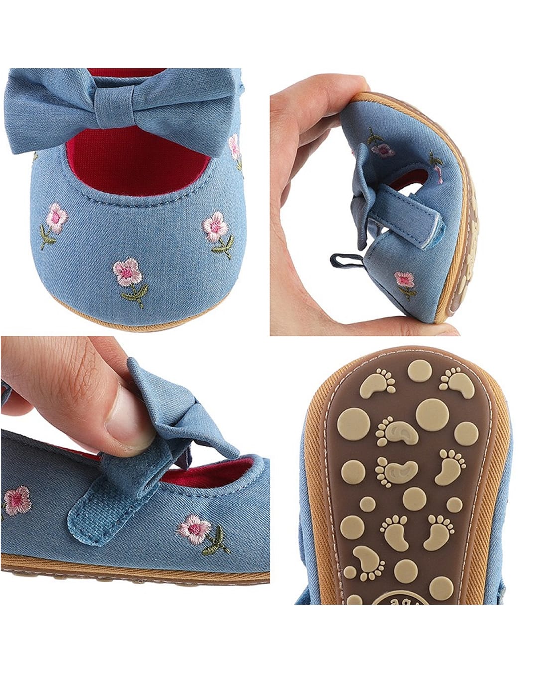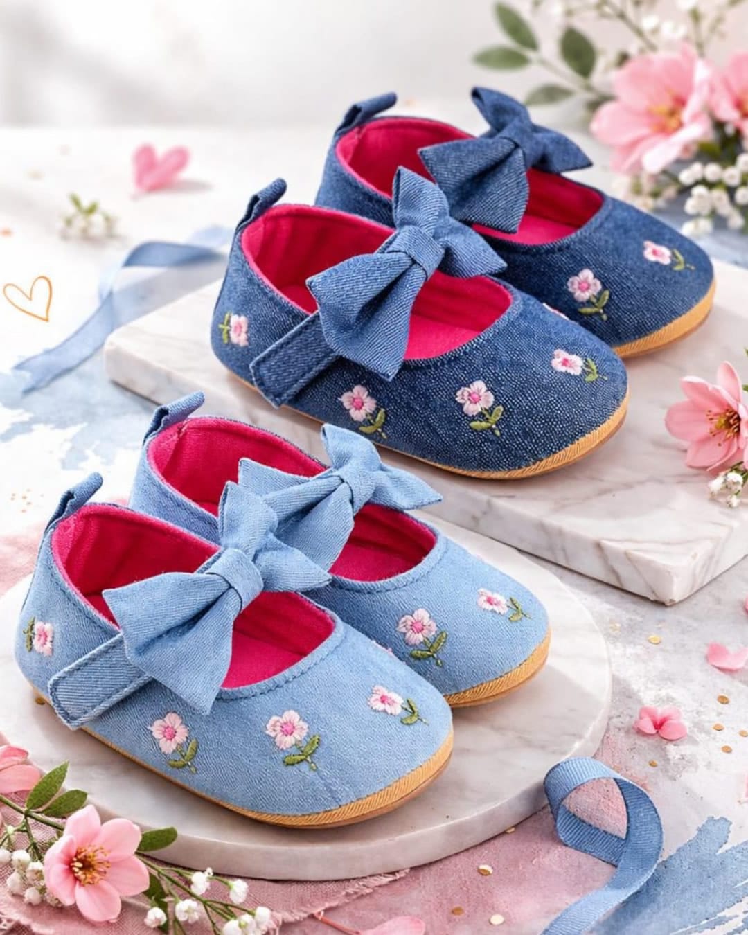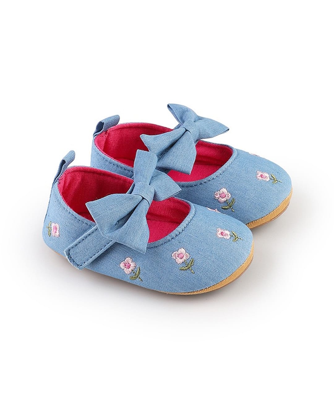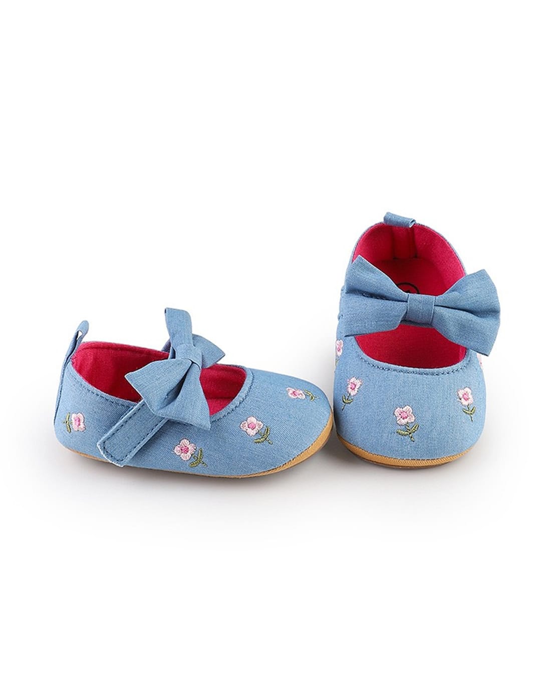 Βρεφικές μπαλαρίνες αγκαλιάς σιέλ με κεντημένα ροζ λουλουδάκια και σόλα από καουτσούκ, ιδανική για τα πρώτα βήματα.