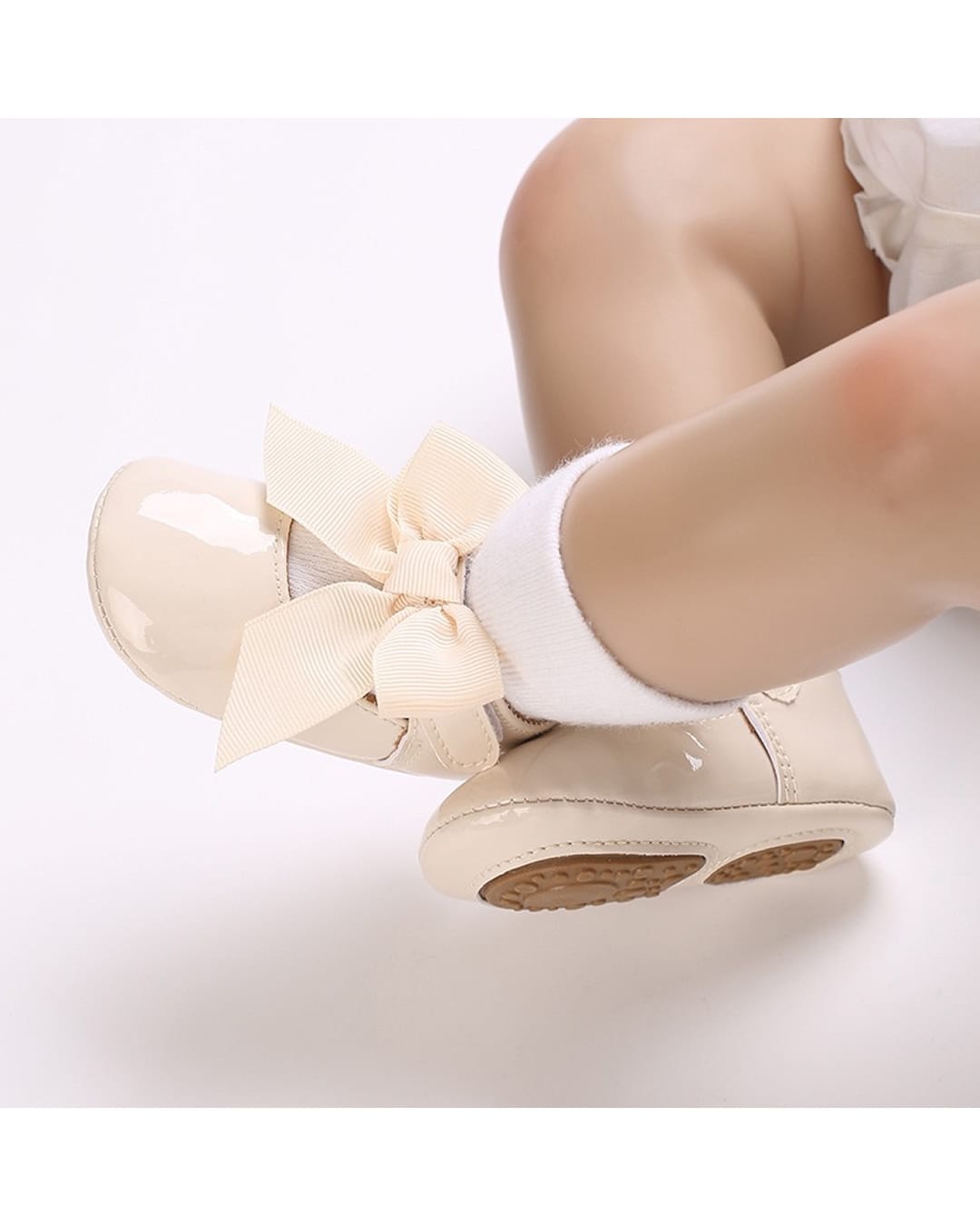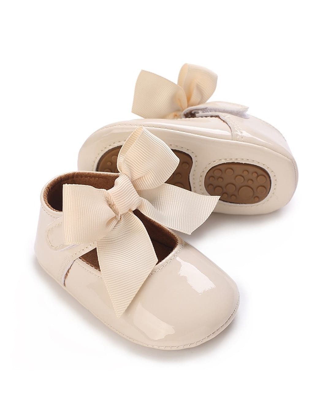 Μπαλαρίνες βρεφικές από λουστρίνι εκρού με υφασμάτινη κορδέλα γκρο και κούμπωμα χρατς. Διαθέτει μαλακή σόλα ιδανική για τα πρώτα βήματα.