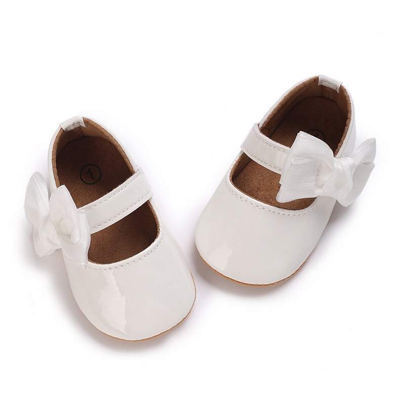 Μπαλαρίνες βρεφικές από λουστρίνι με σατέν φιόγκο λευκές και κούμπωμα χρατς. Διαθέτει μαλακή σόλα ιδανική για τα πρώτα βήματα.