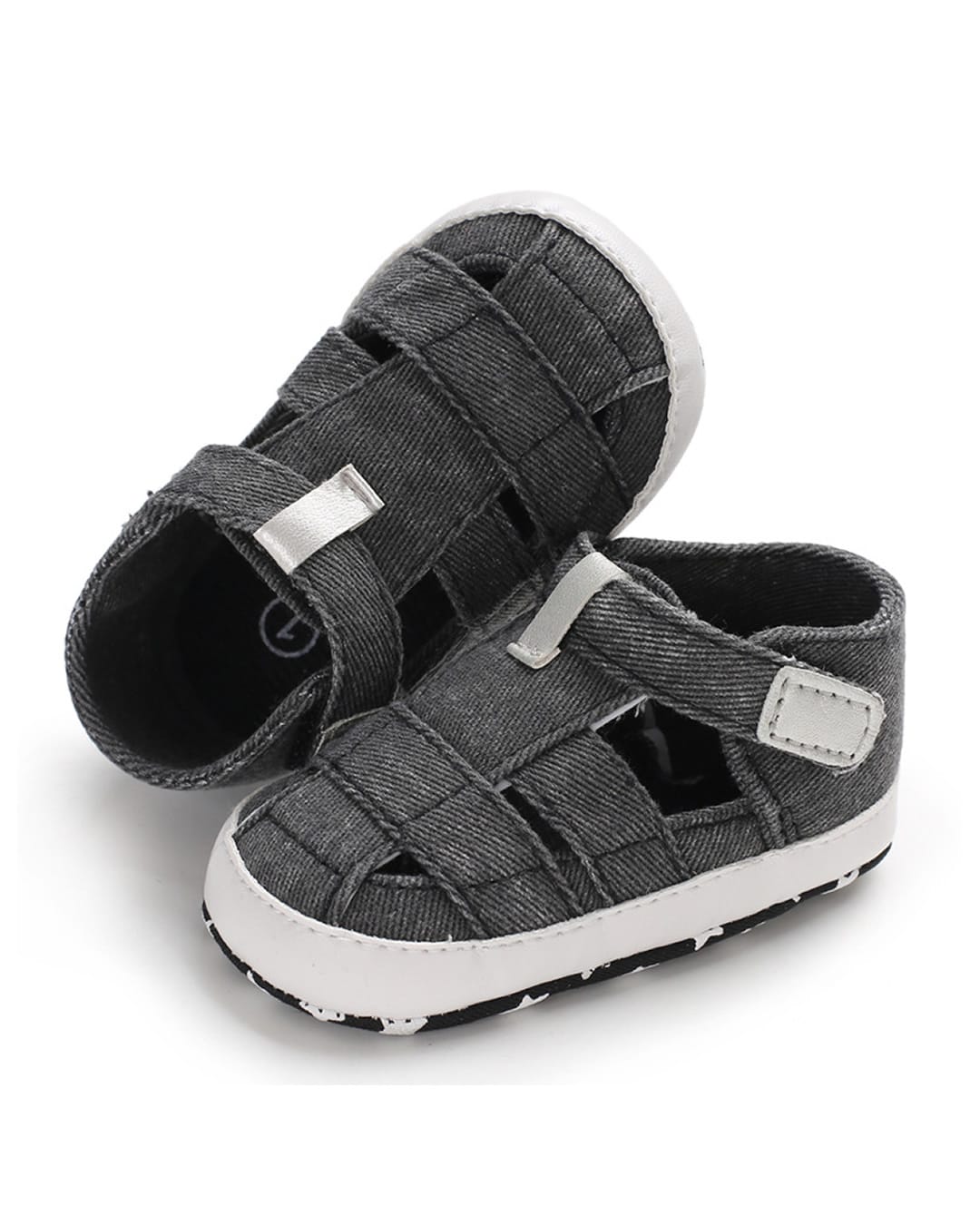 Βρεφικά πέδιλα αγκαλιάς ανθρακί τζιν με κούμπωμα χρατς και υφασμάτινο πάτο.