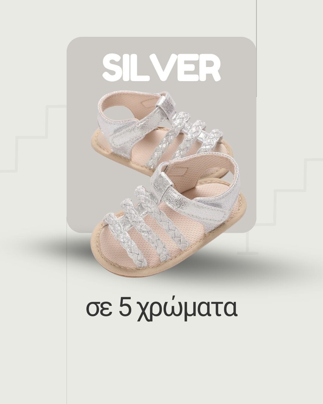 Πέδιλα αγκαλιάς ασημί μεταλιζέ με λουράκια πλεξούδα και δέσιμο χρατς. Σόλα από καουτσούκ, ιδανικά ακόμη και για τα πρώτα βήματα.
