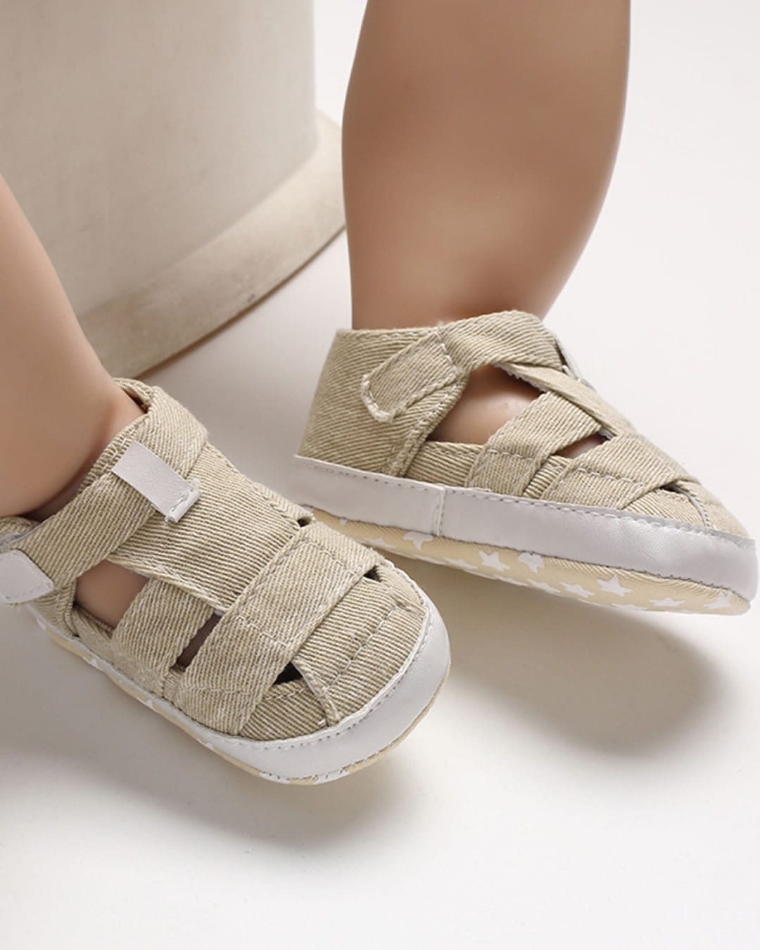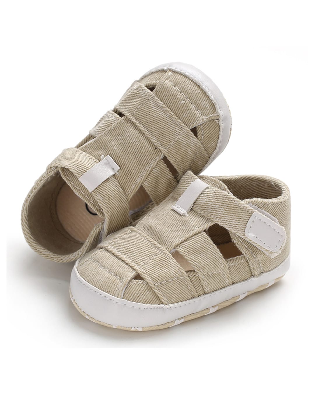 Βρεφικά πέδιλα αγκαλιάς μπεζ τζιν με κούμπωμα χρατς και υφασμάτινο πάτο.