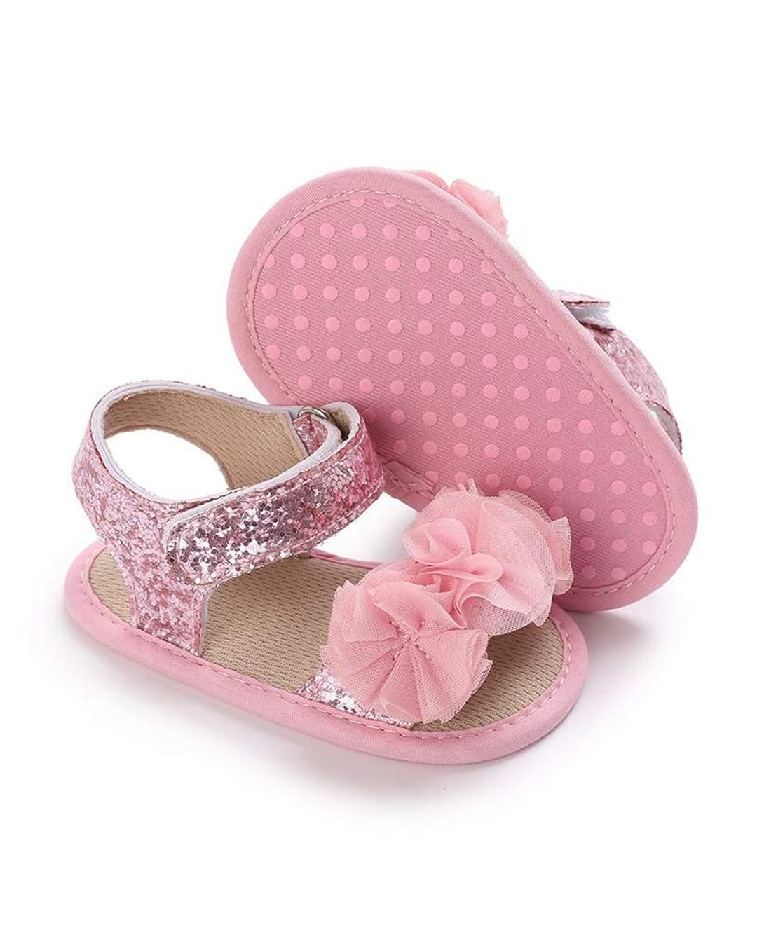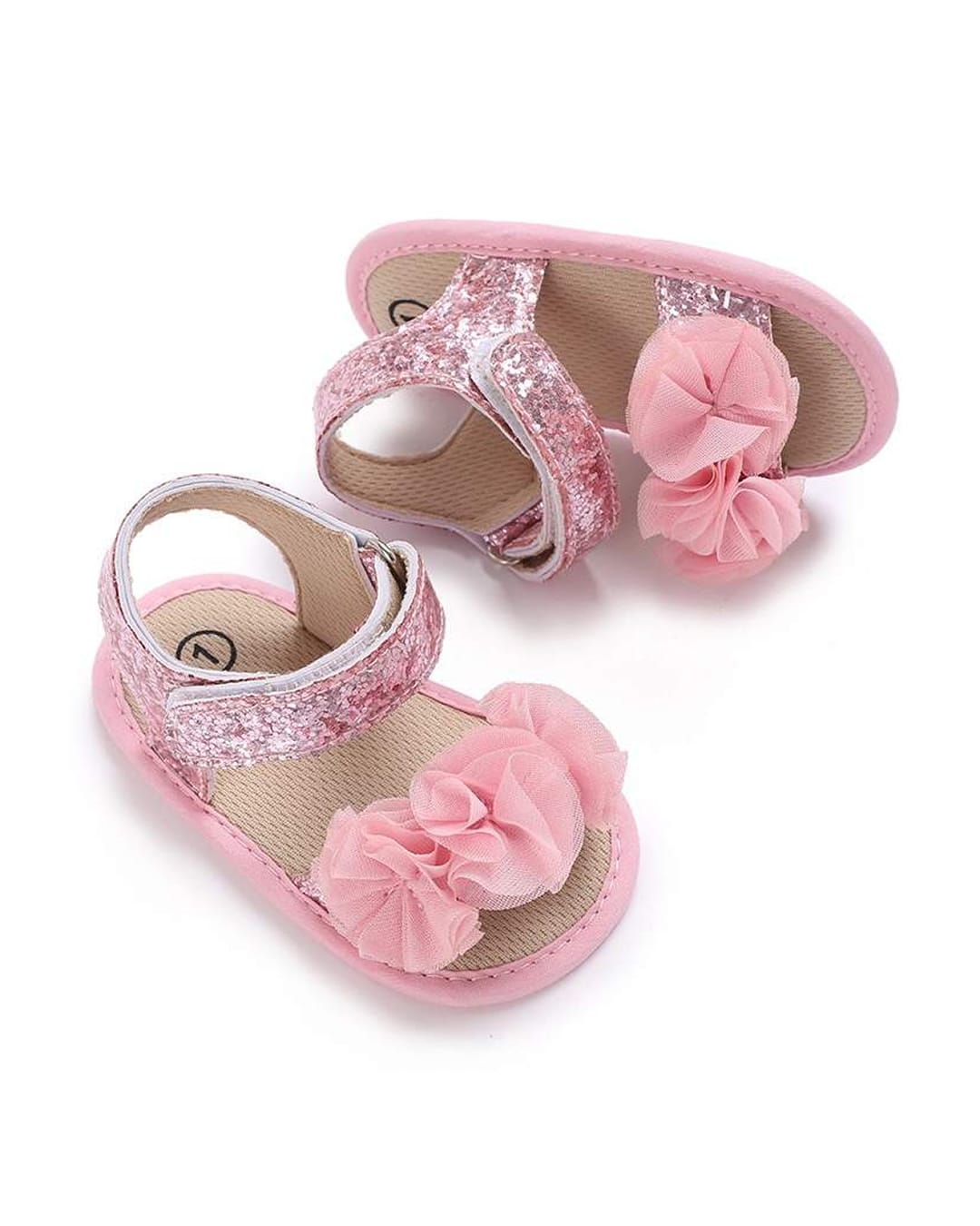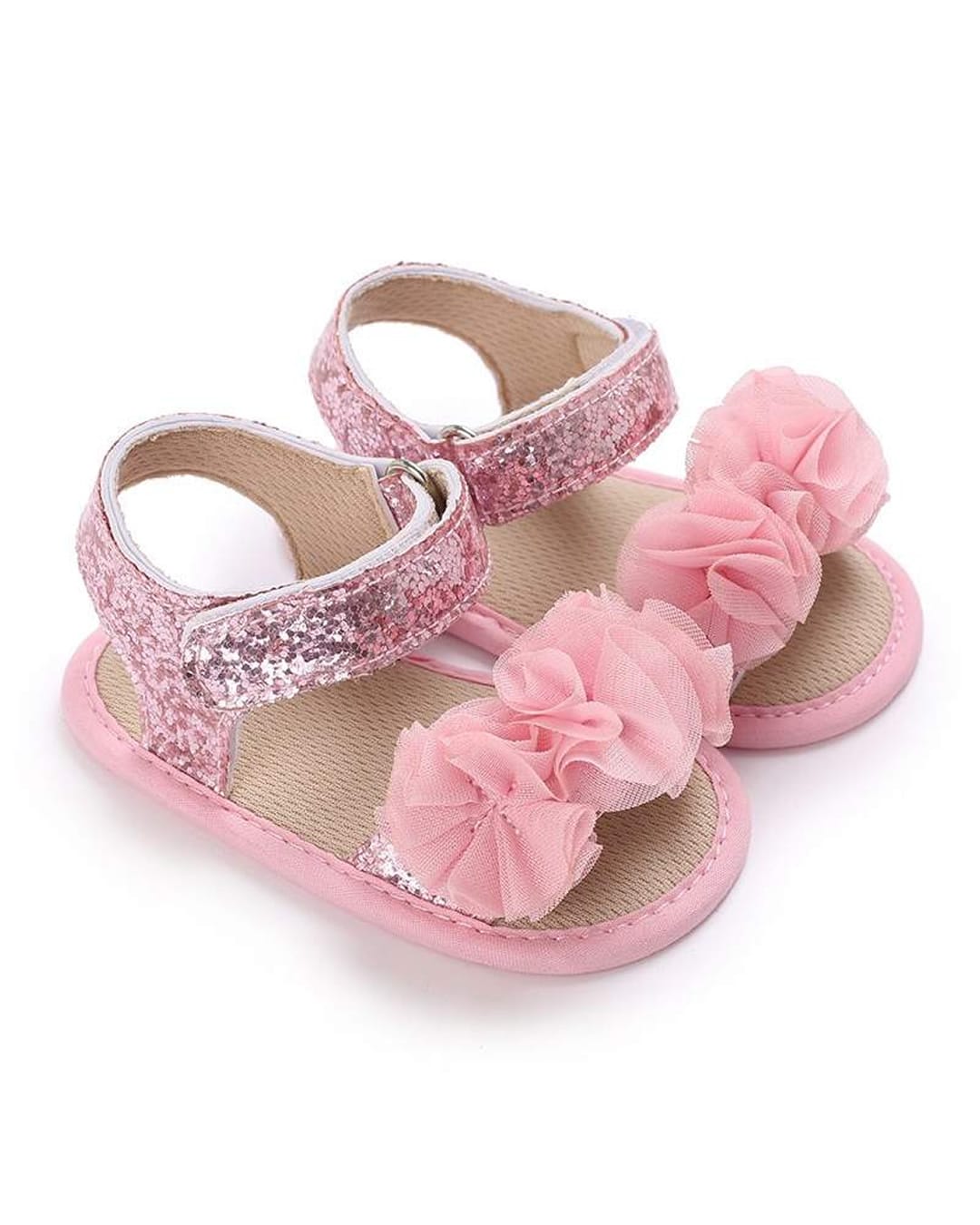 Πέδιλα αγκαλιάς ροζ glitter με χρατς στον αστράγαλο και 3D λουλούδια.