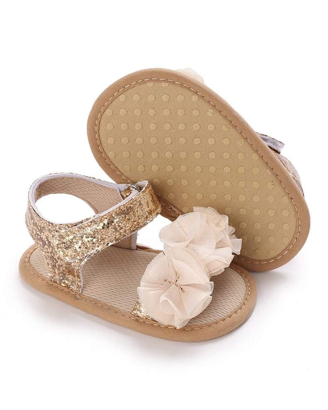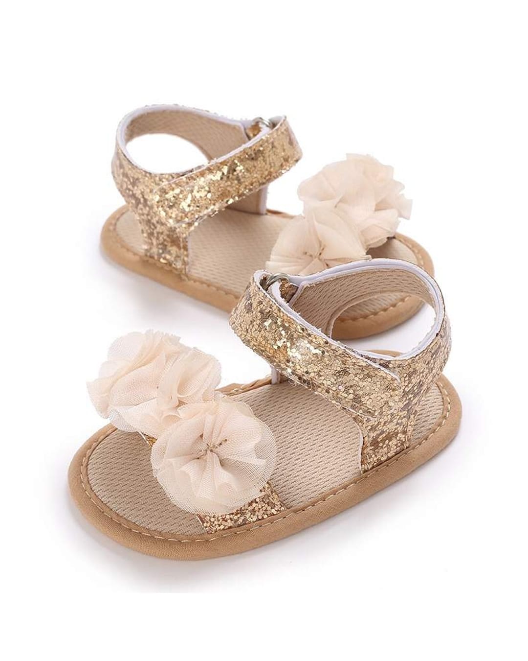 Πέδιλα αγκαλιάς χρυσά glitter με χρατς στον αστράγαλο και 3D λουλούδια.