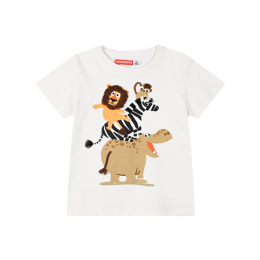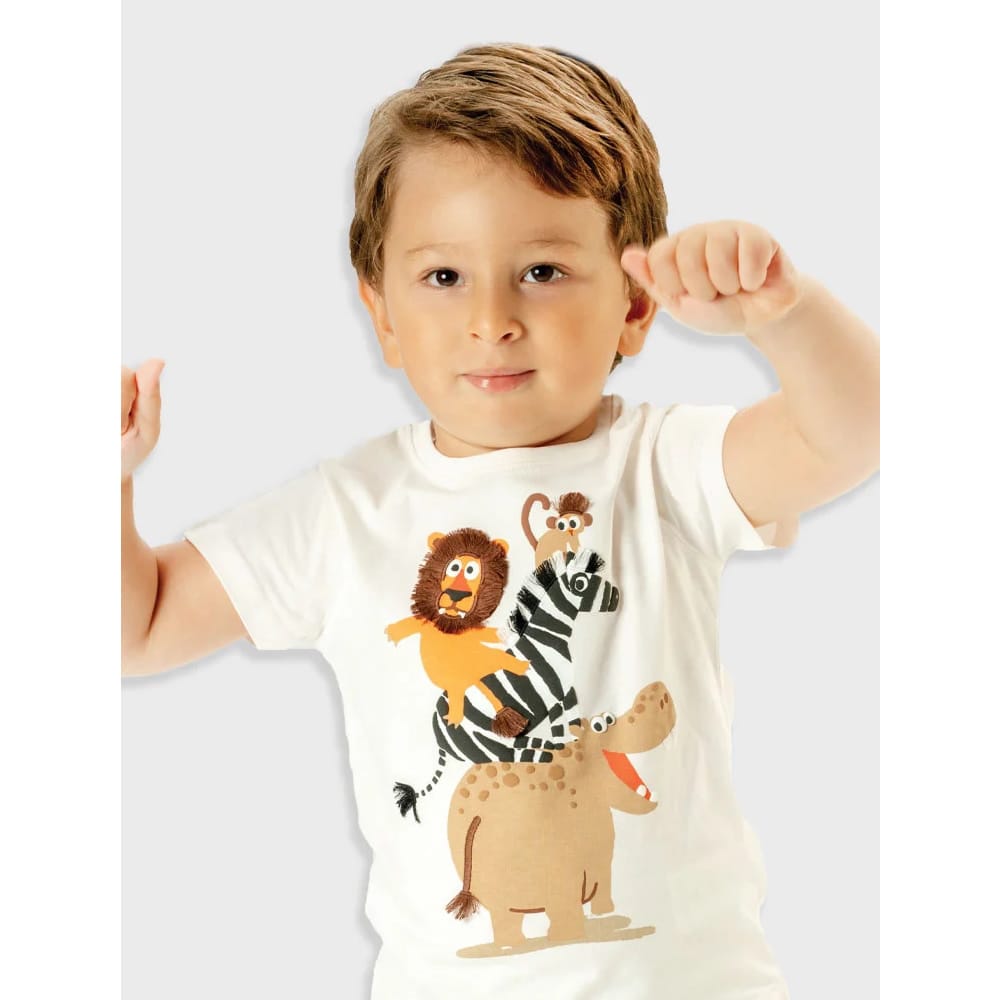 Παιδική μπλούζα για αγόρι κοντομάνικη λευκή με Ζωάκια της Ζούγκλας με 3D λεπτομέρειες (κροσσάκια στο τρίχωμα των ζώων).