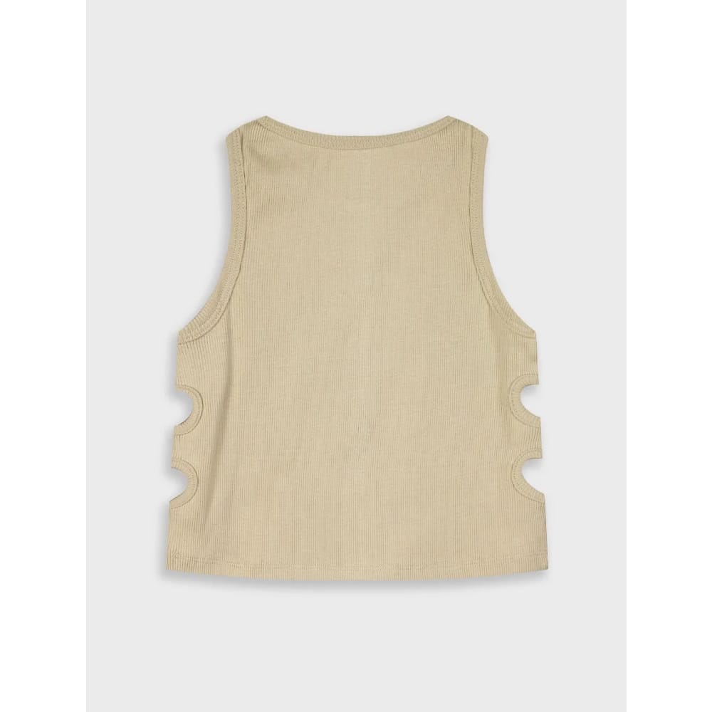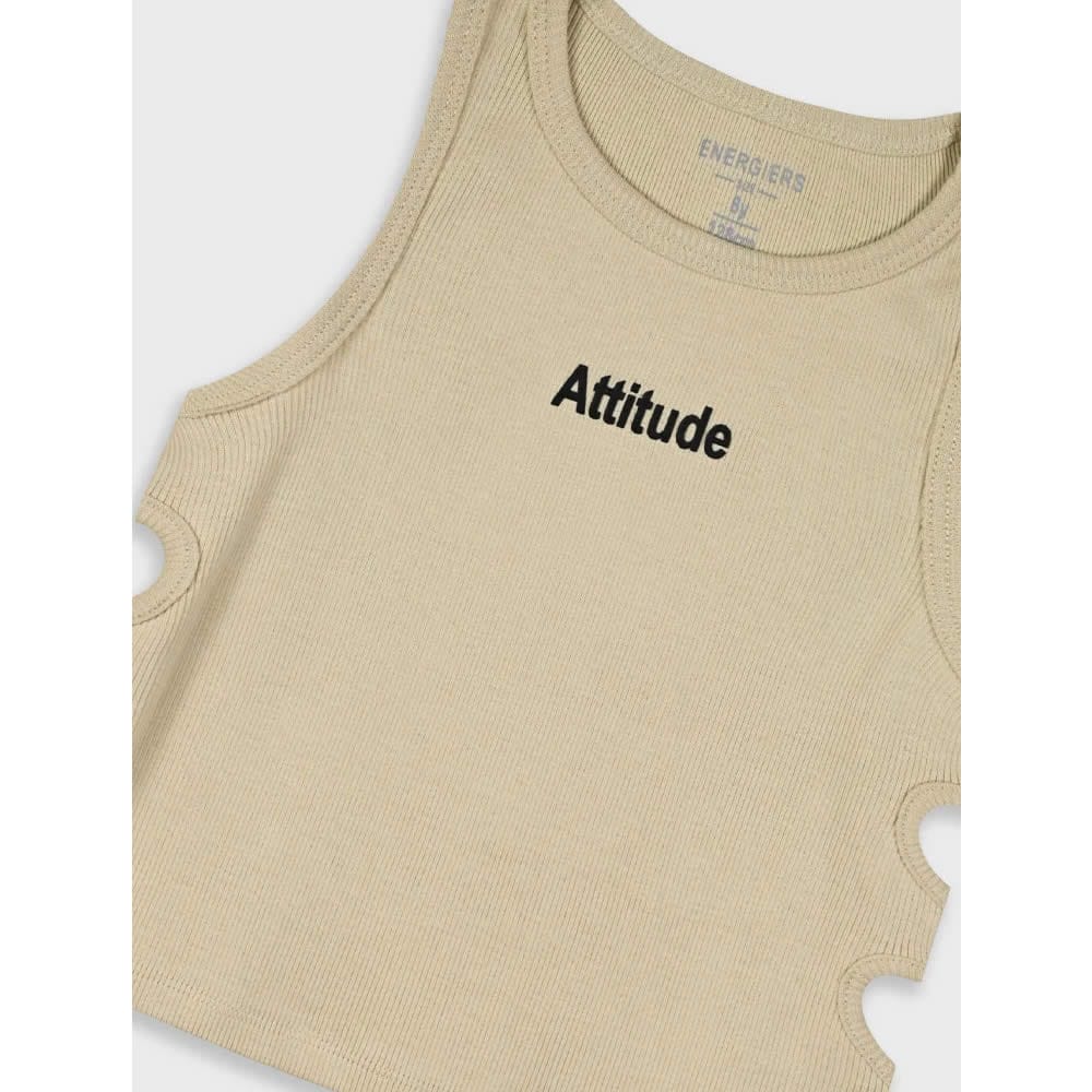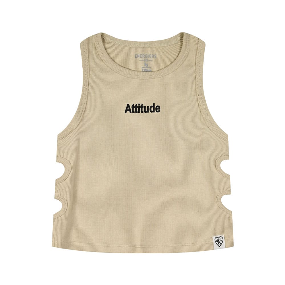 Παιδική μπλούζα crop top αμάνικη ριπ για κορίτσι μπεζ με ανοίγματα στα πλάγια και κέντημα Attitude