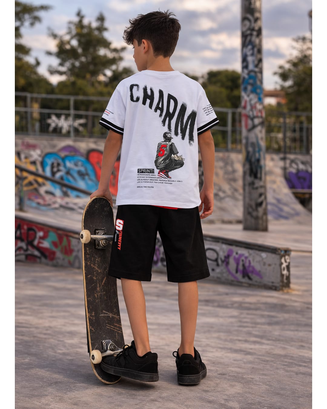 - μπλούζα κοντομάνικη λευκή με τύπωμα στο εμπρός και πίσω μέρος Charm και λάστιχο στο τελείωμα στο μανίκι