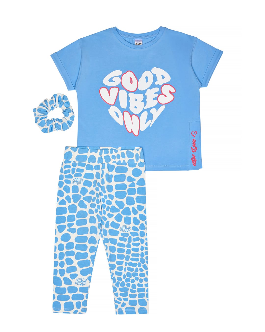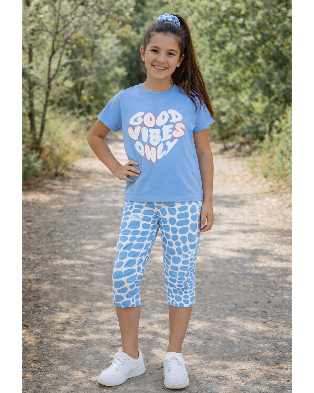 - μπλούζα κοντομάνικη γαλάζια με τύπωμα Good vibes only και άνοιγμα στα πλάγια