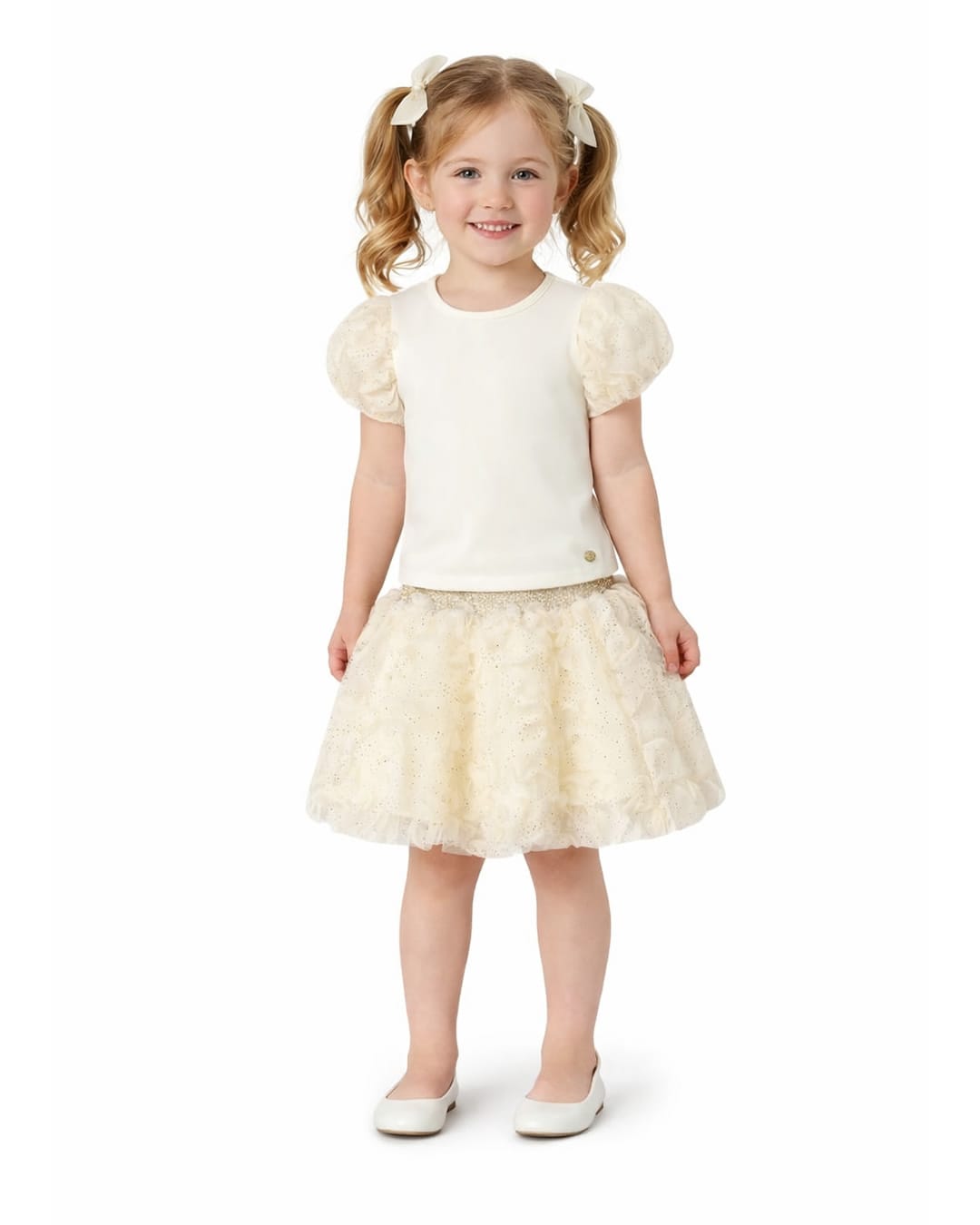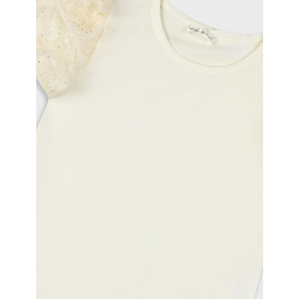 - μπλούζα εκρού κοντομάνικη με ανάγλυφα glitter μανίκια