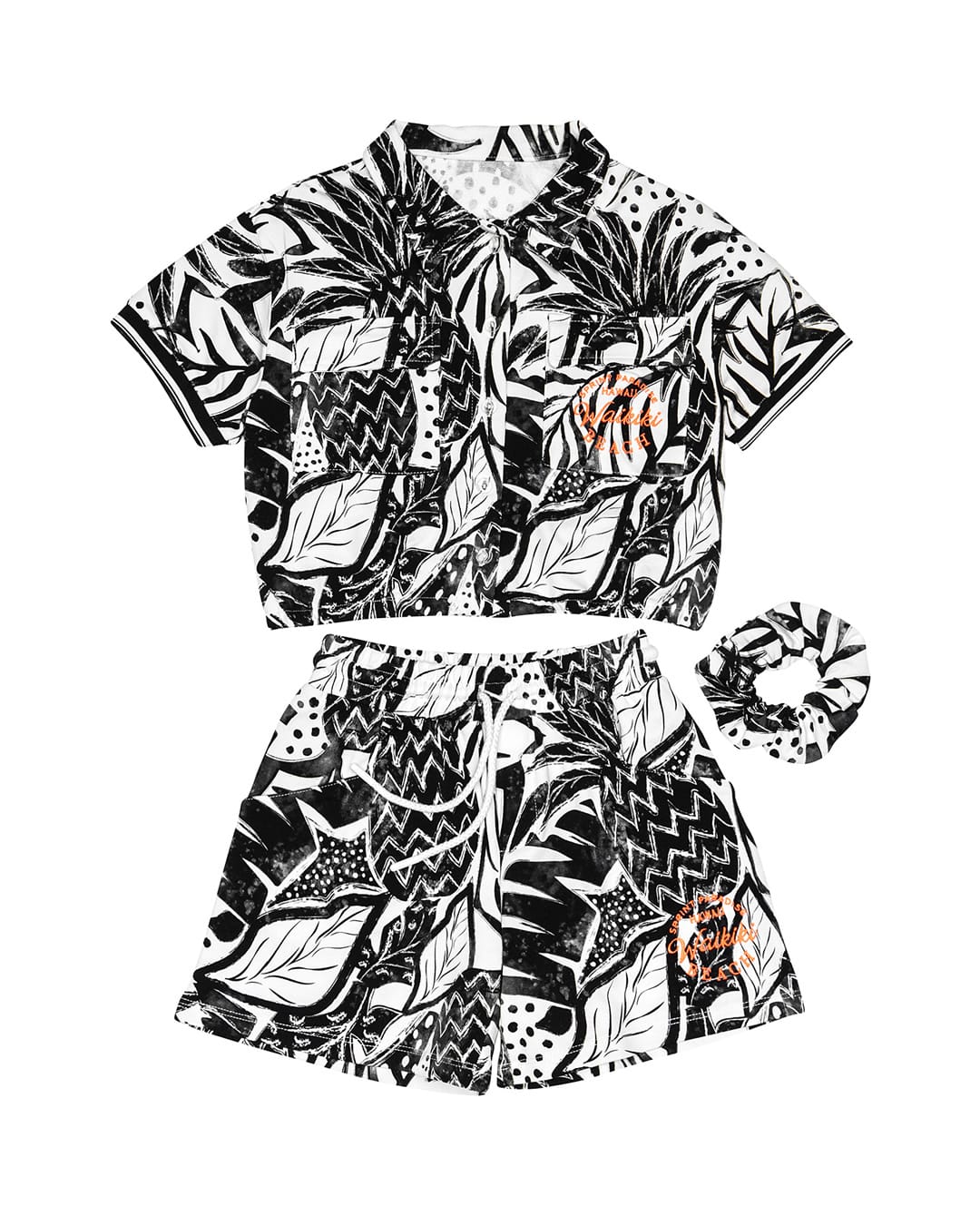 - πουκάμισο crop top κοντομάνικο λευκό-μαύρο tropic με σχέδιο τσέπες, fluo κέντημα και λάστιχο στο τελείωμα στο μανίκι