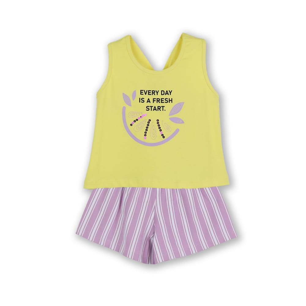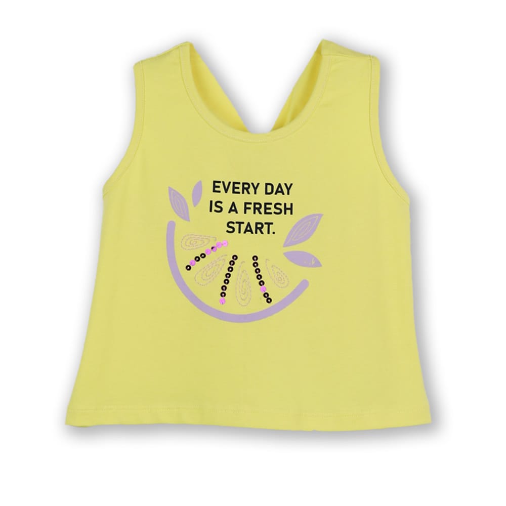 - μπλούζα κίτρινη αμάνικη με τύπωμα λεμονάκι με παγιέτες στο μπροστινό μέρος και τσαχπινιά στην πλάτη