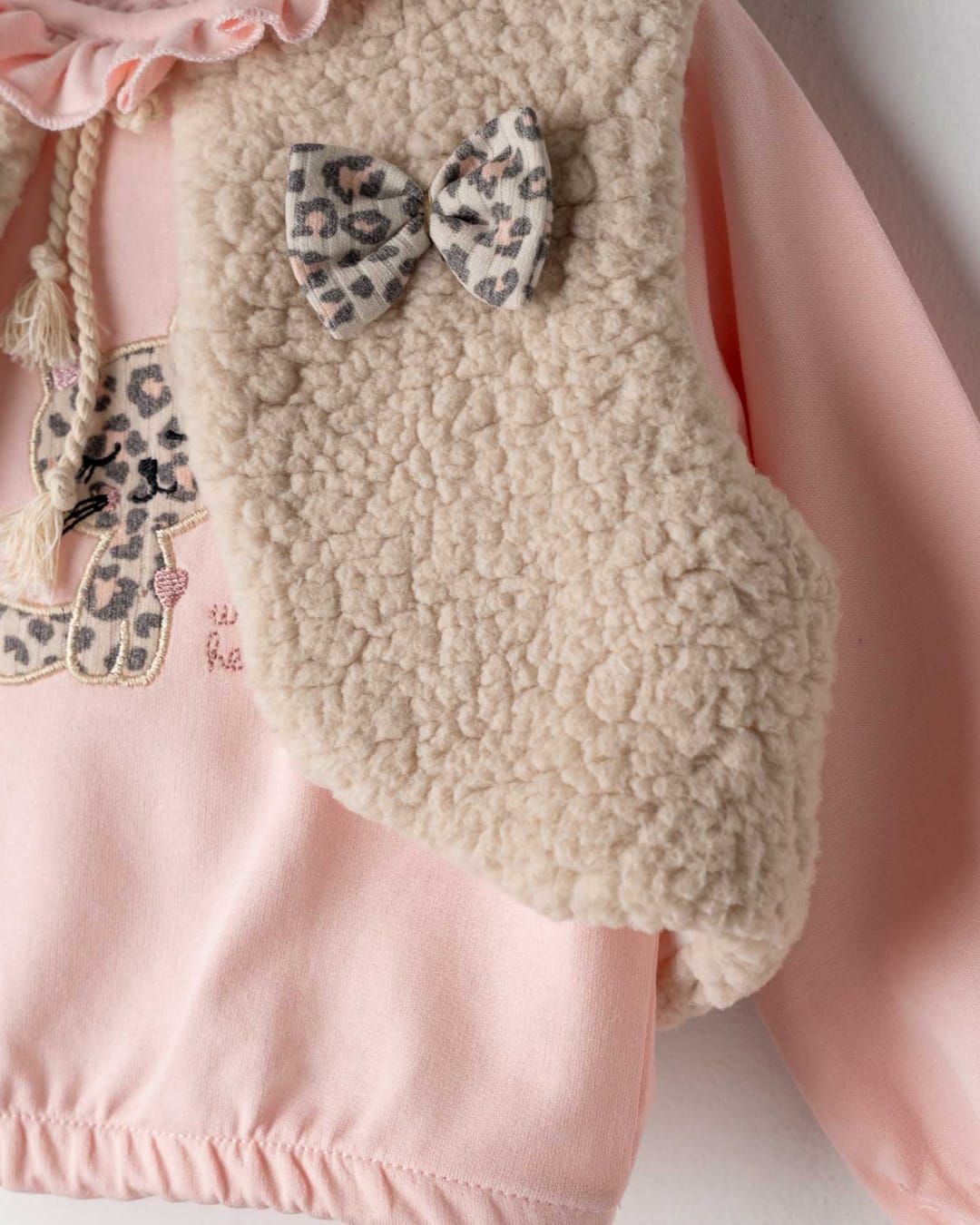 - μπλούζα ροζ της πούδρας με κέντημα γάτα, βολάν στην λαιμόκοψη και λάστιχο στον καρπό