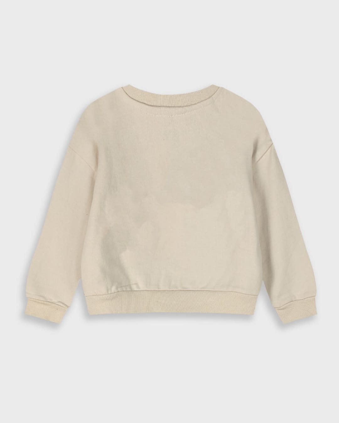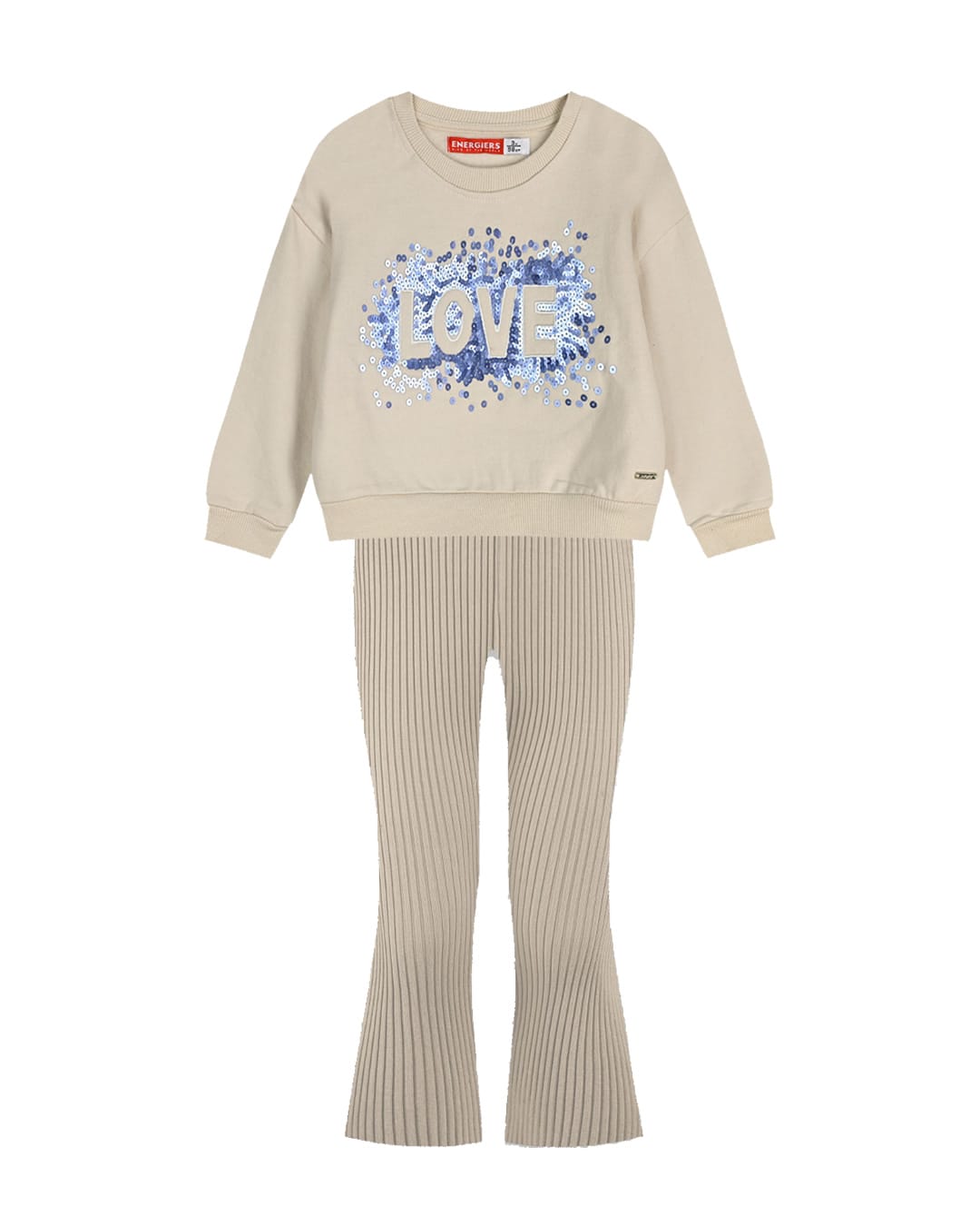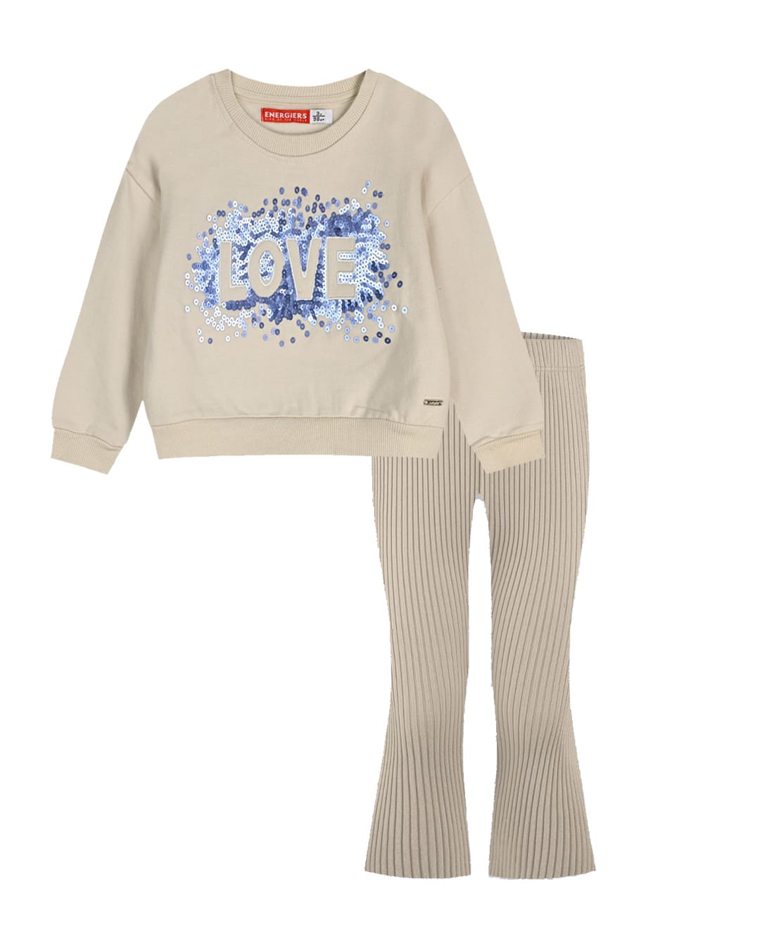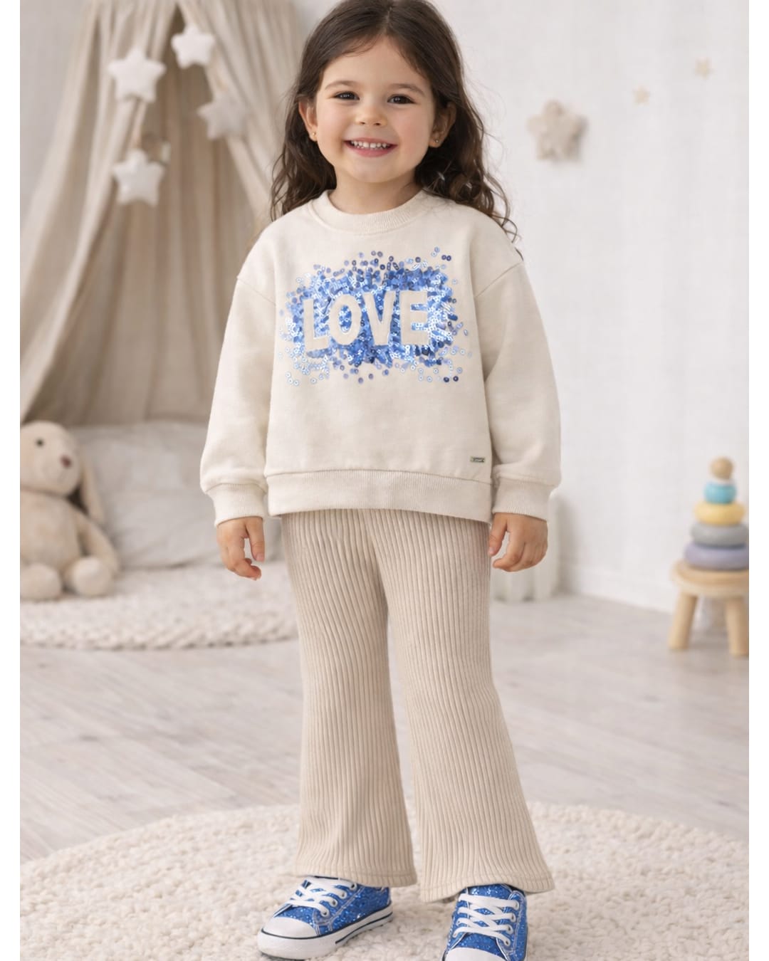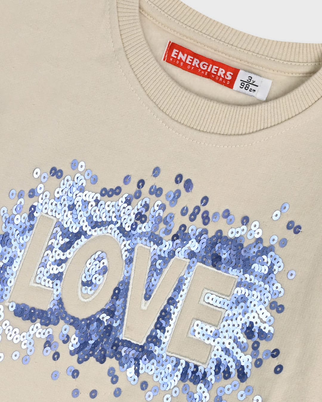 - μπλούζα με ελαφρύ χνούδι στο χρώμα της βανίλιας με παγιέτες στο μπροστινό μέρος Love
