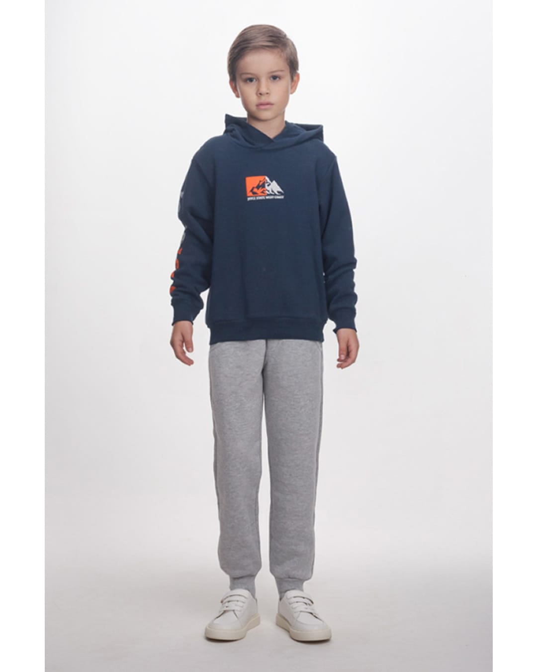 - μπλούζα fleece μπλε σκούρη με τύπωμα στην μπροστά πλευρά και στο μανίκι, κουκούλα