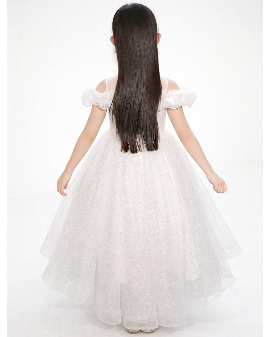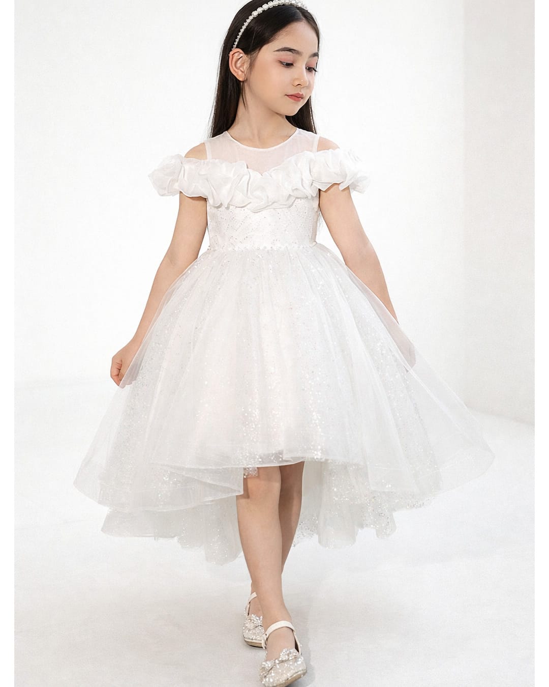 Παιδικό φόρεμα λευκό με ιδιαίτερους ώμους, παγιέτες και ασημί glitter ύφασμα κάτω από το τούλι, με ασυμμετρία στο εμπρός με το πίσω μέρος.