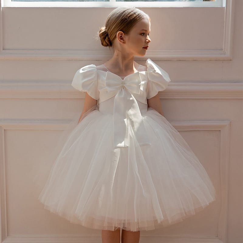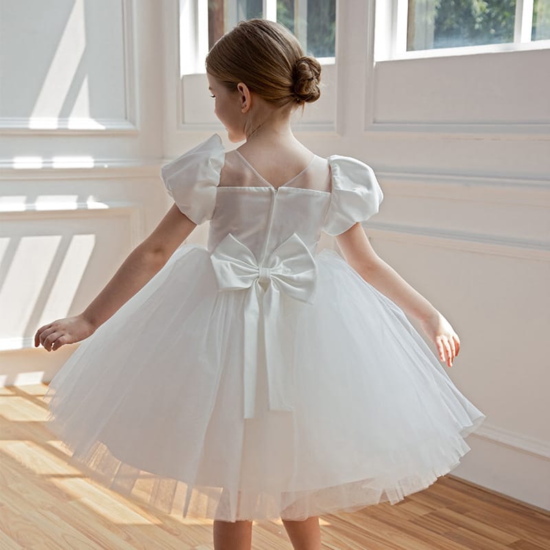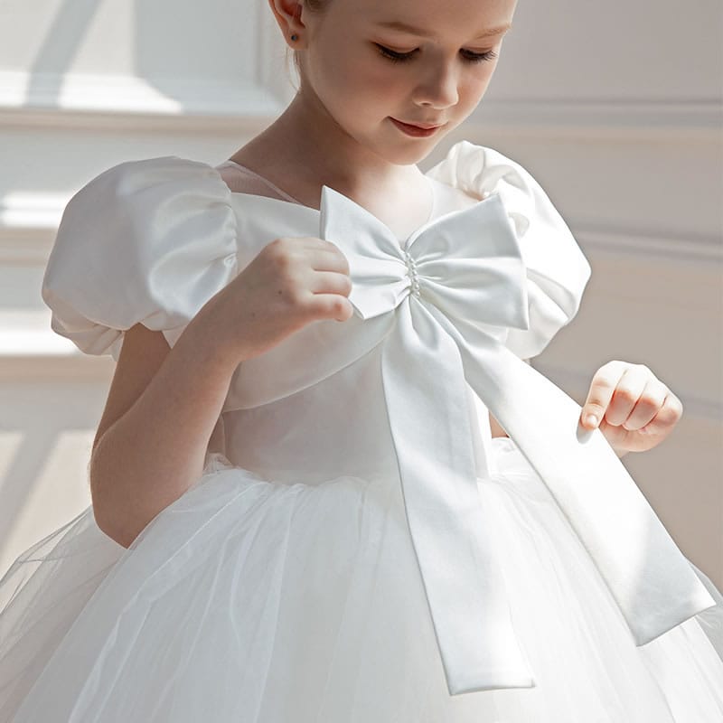 Παιδικό φόρεμα λευκό κοντομάνικο με σατινέ επάνω μέρος με φιόγκο με πέρλες και τούλινο κάτω μέρος. Διαθέτει αποσπώμενο φιόγκο στο πίσω μέρος της μέσης.