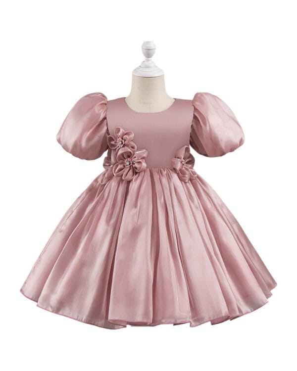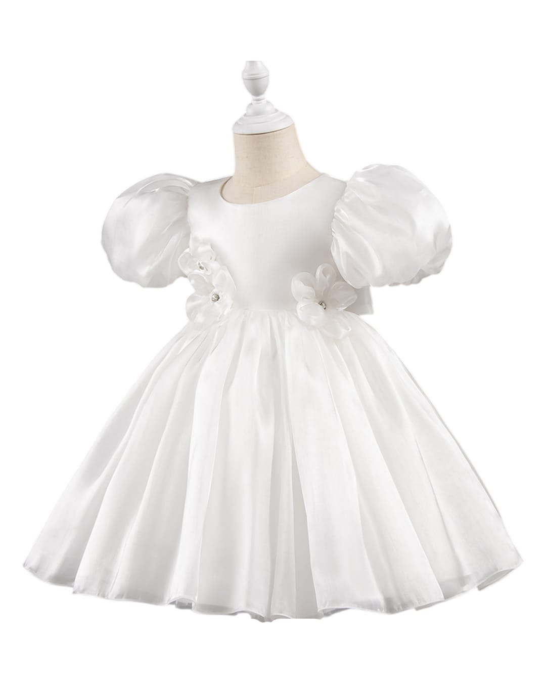 Παιδικό φόρεμα λευκό σατινέ με baloon μανίκια και 3D λουλουδάκια στη μέση.