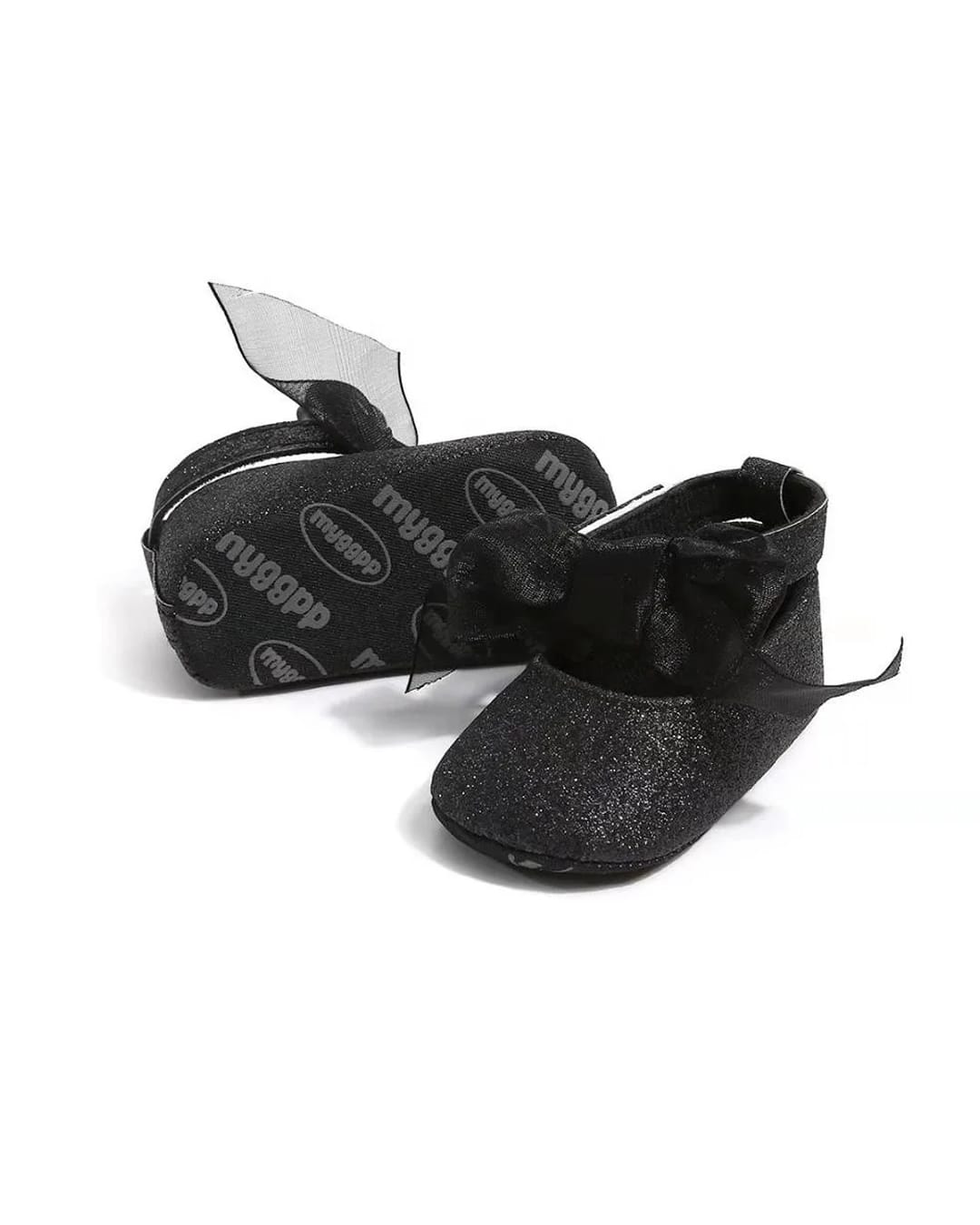 Παπουτσάκια αγκαλιάς glitter μαύρα με μπαρέτα γύρω από τον αστράγαλο και μαύρο φιόγκο.