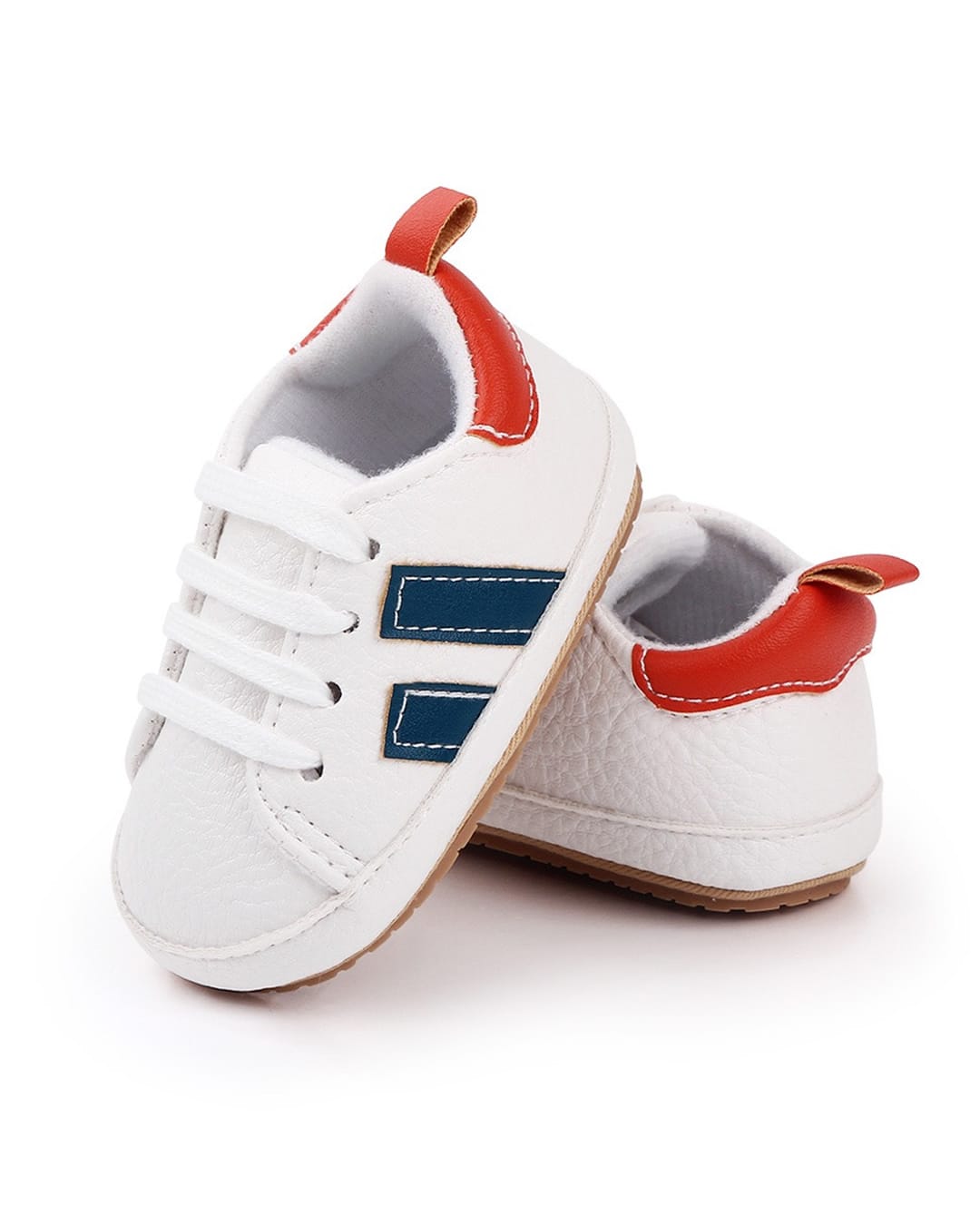 Παπουτσάκια αγκαλιάς τύπου sneakers λευκά με μπλε γραμμές στο πλάι, πορτοκαλί στο πίσω μέρος και μαλακή σόλα που στηρίζει ιδανικά το ποδαράκι του μικρού ακόμη και στα πρώτα του βήματα.