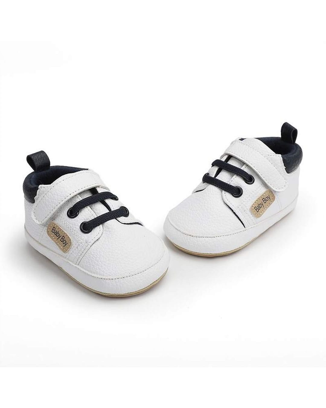 Παπουτσάκια τύπου sneakers λευκό με χρατς, κορδονάκια και μπλε λεπτομέρεια στο πίσω μέρος. Ιδανικά ακόμη και για τα πρώτα βήματα καθώς διαθέτουν μαλακή σόλα από καουτσούκ.