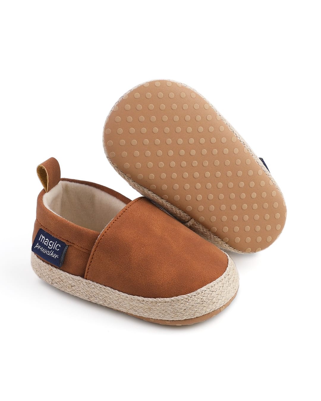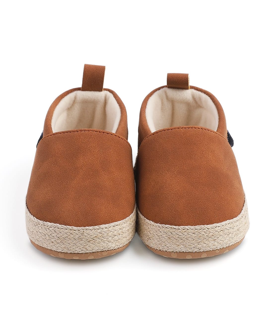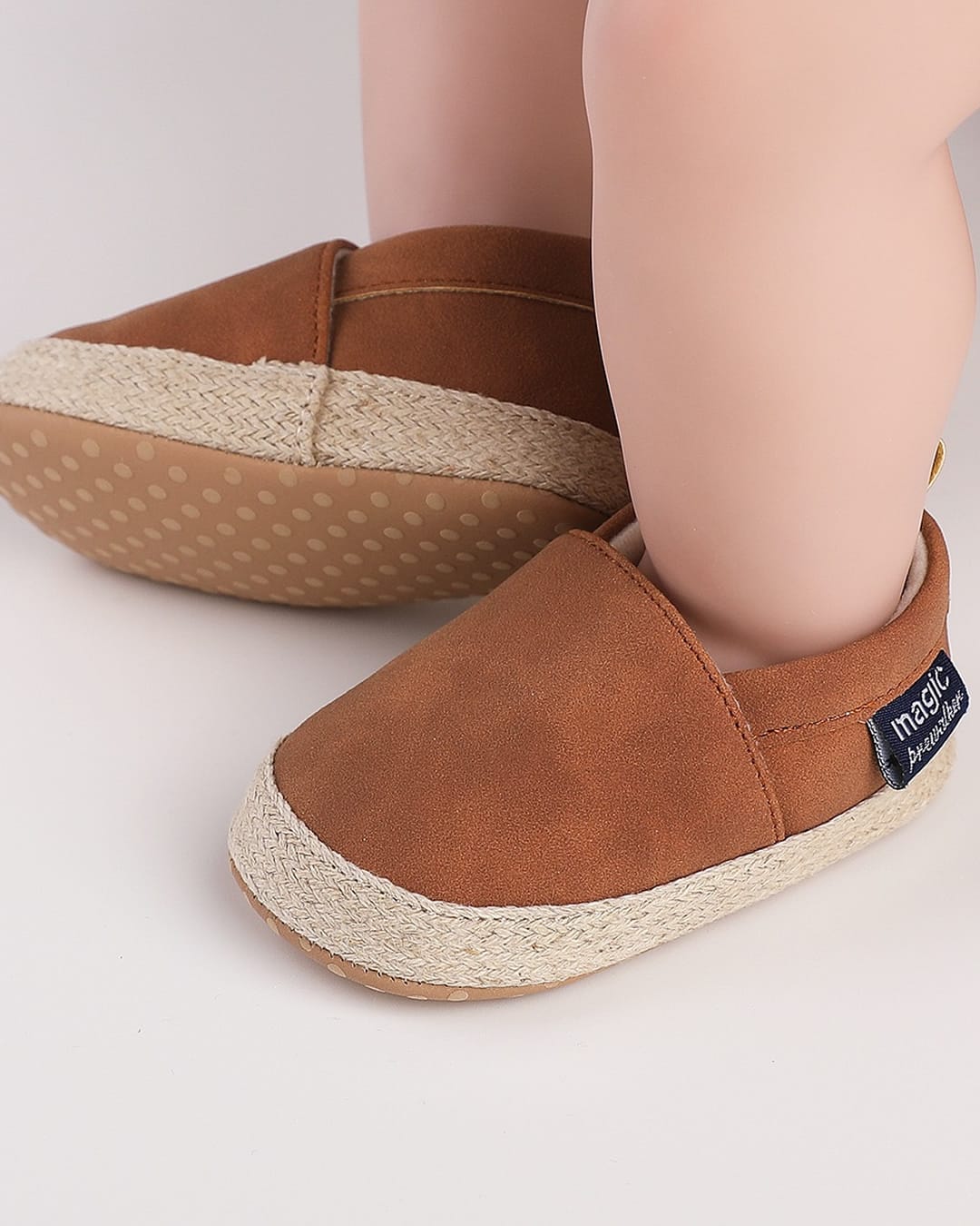 Παπουτσάκια αγκαλιάς καφέ σουέτ τύπου εσπαντρίγιες με υφασμάτινο πάτο, ιδανικά ακόμη και για νεογέννητο.