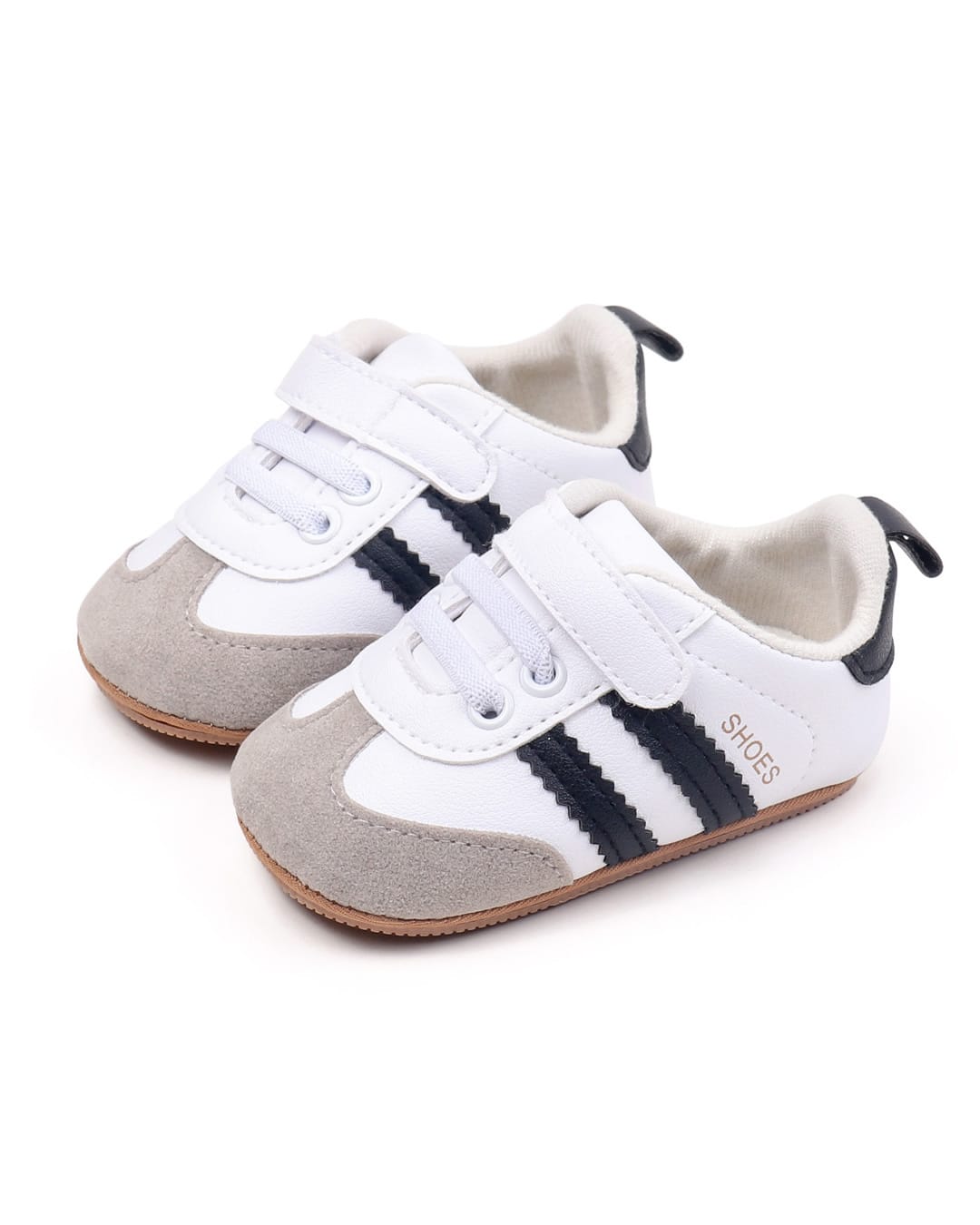 Βρεφικά παπούτσια αγκαλιάς λευκά με μαύρες ρίγες, sneakers με μαλακή σόλα από καουτσούκ, ιδανική για τα πρώτα βήματα.