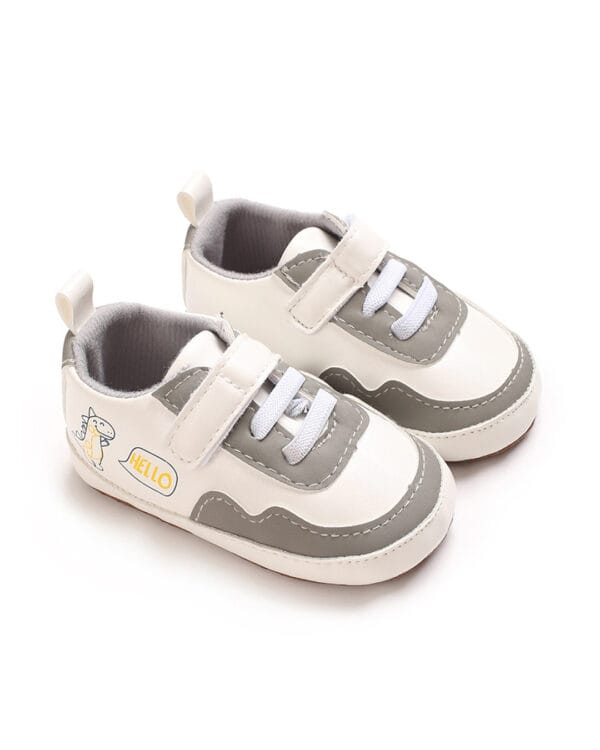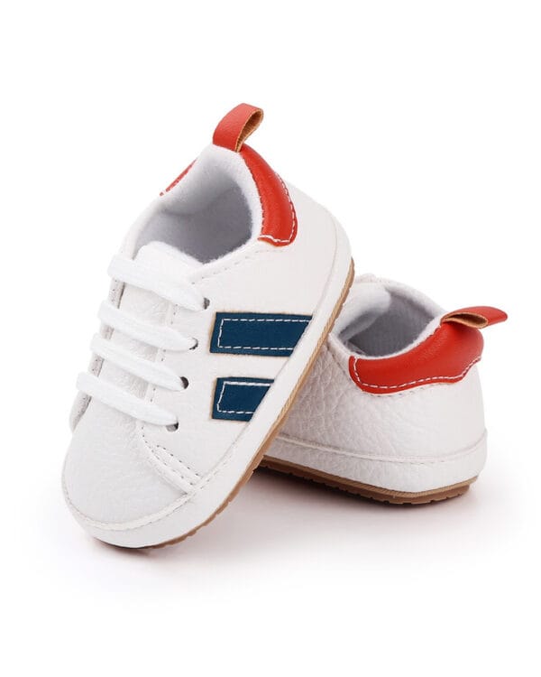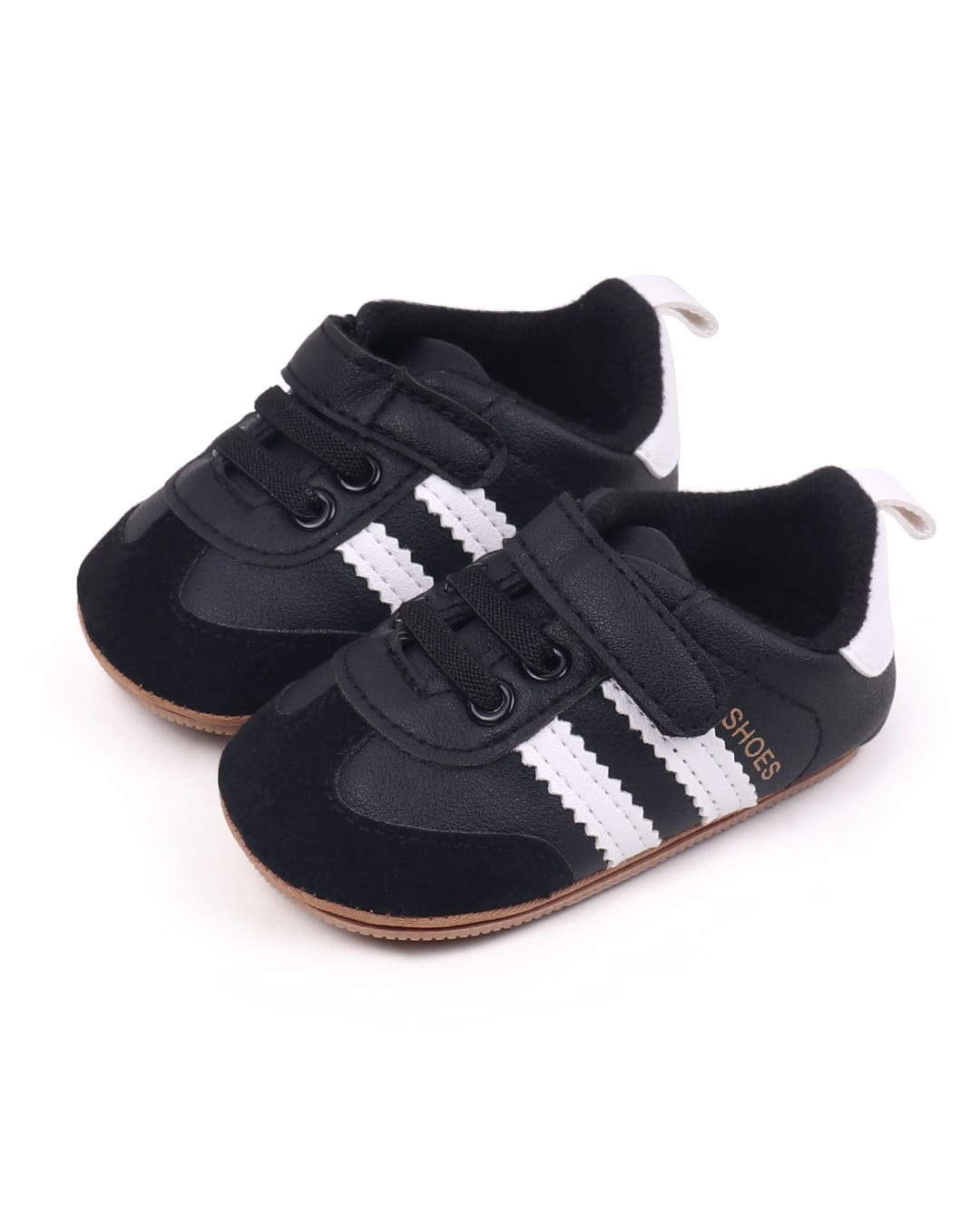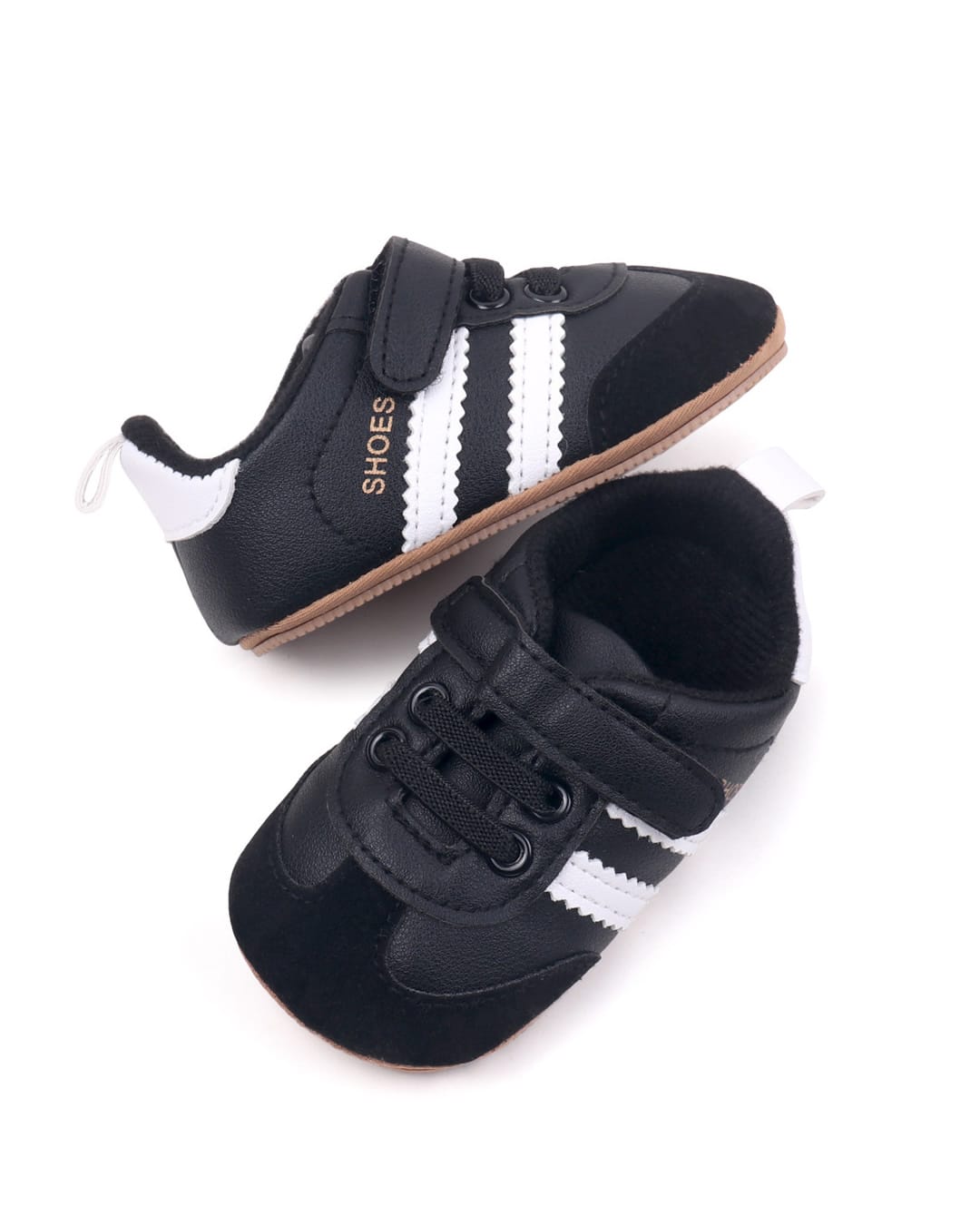 Βρεφικά παπούτσια αγκαλιάς μαύρα με λευκές ρίγες, sneakers με μαλακή σόλα από καουτσούκ, ιδανική για τα πρώτα βήματα.