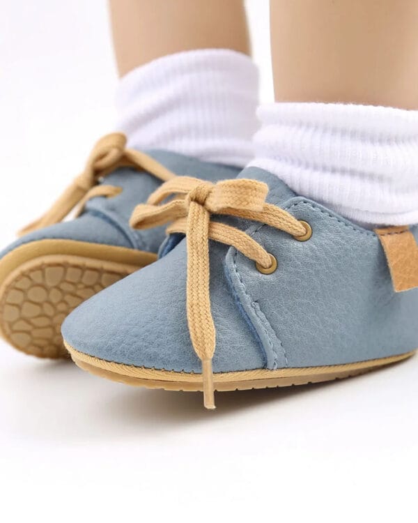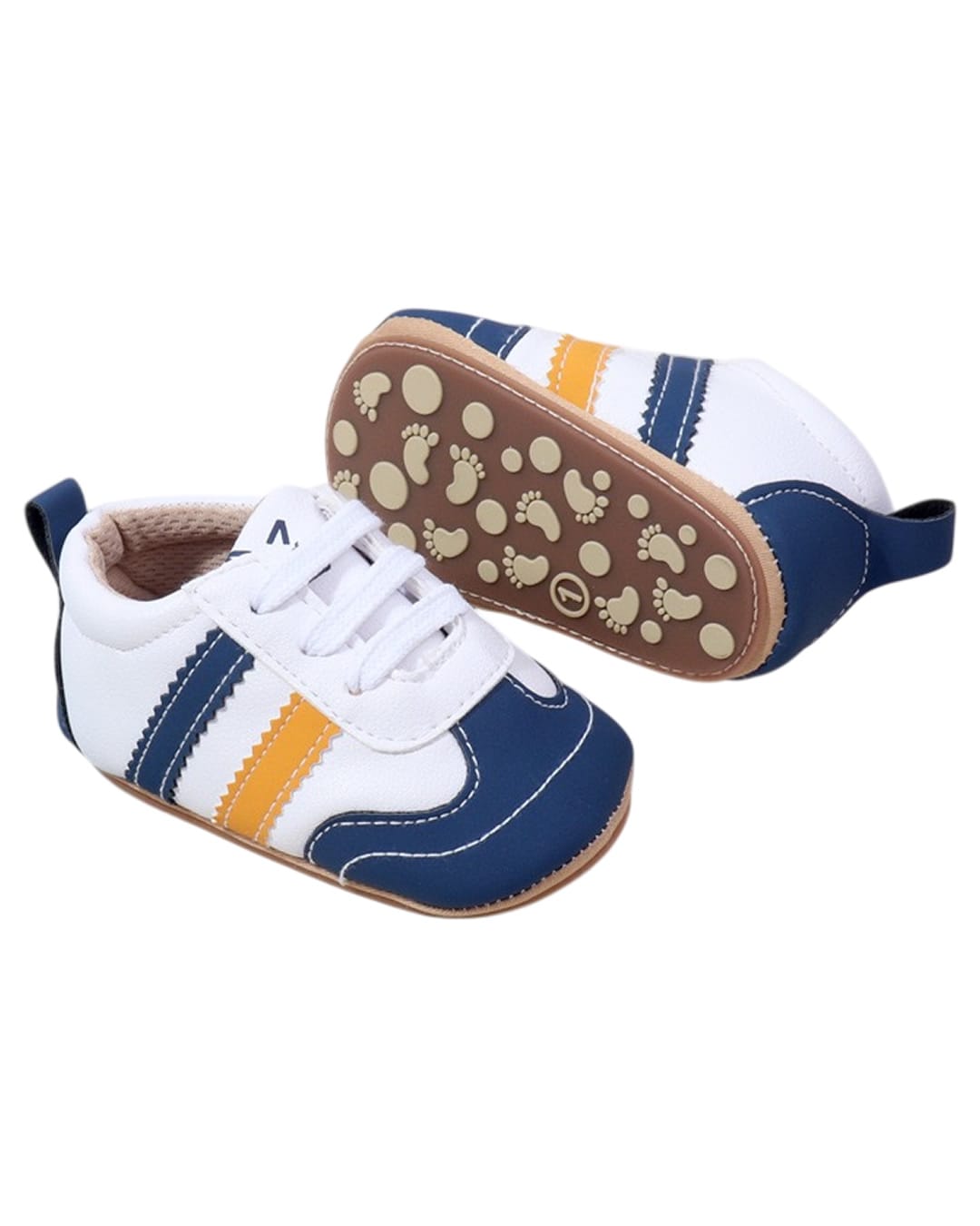 Βρεφικά παπούτσια αγκαλιάς λευκά sneakers με μπλε και κίτρινες λεπτομέρειες. Σόλα από καουτσούκ, ιδανική για τα πρώτα βήματα.