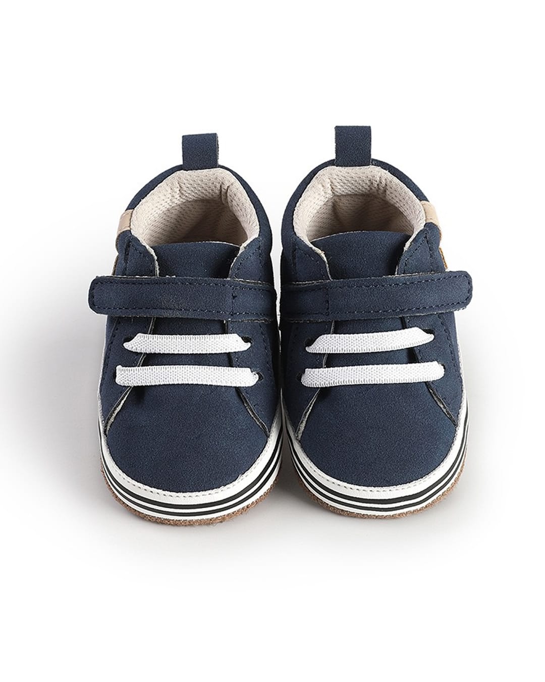 Βρεφικά παπούτσια αγκαλιάς μπλε σκούρα από δερματίνη με κούμπωμα χρατς και υφασμάτινη σόλα.