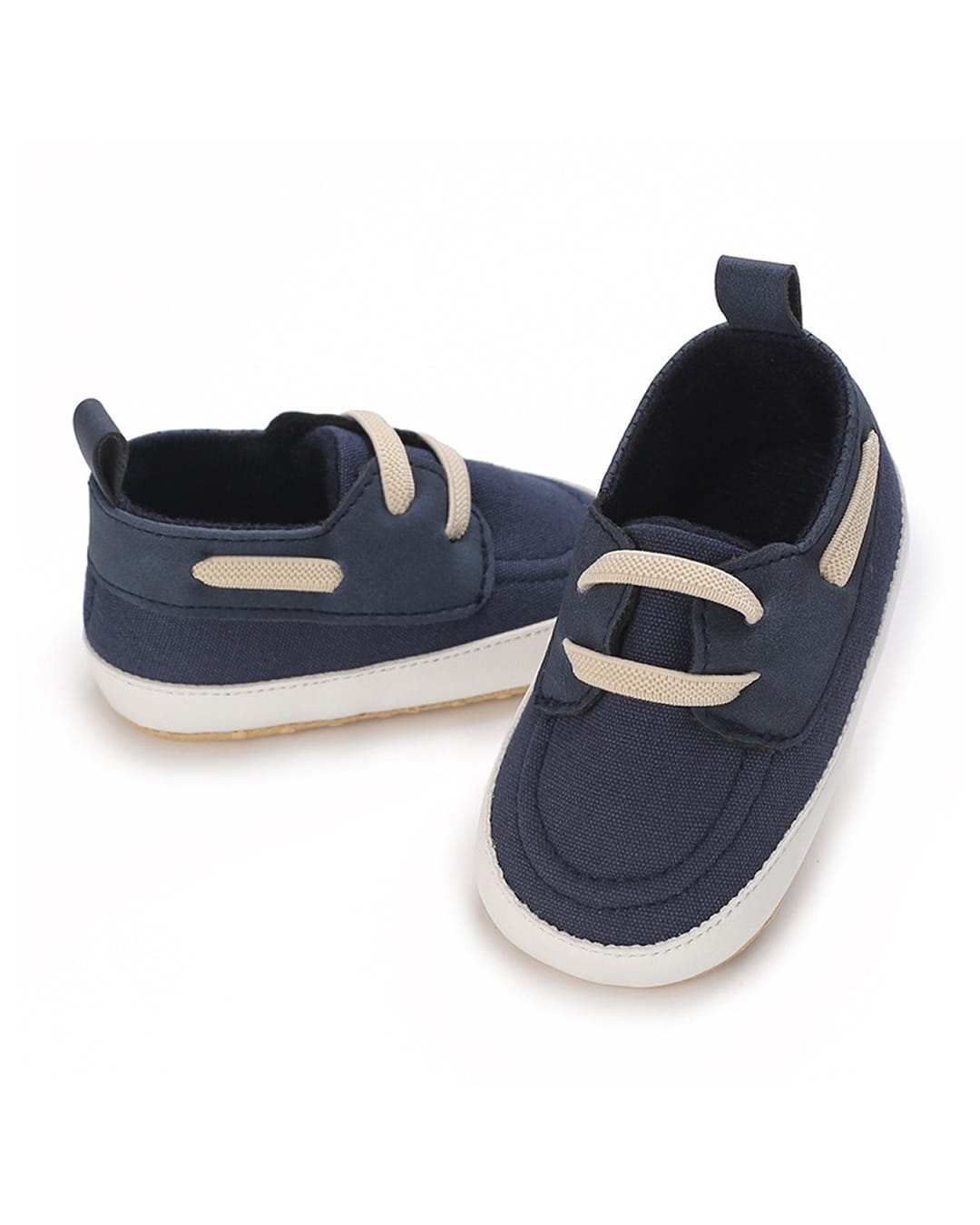 Παπούτσια αγκαλιάς μπλε-λευκό υφασμάτινα με δερμάτινες λεπτομέρειες και ελαστικά κορδονάκια.