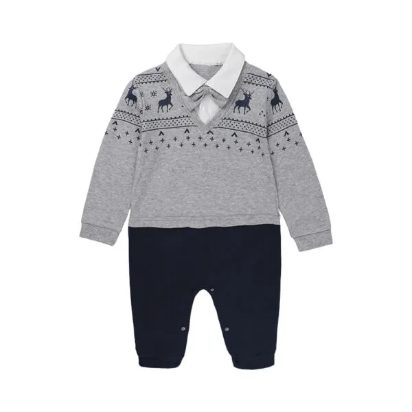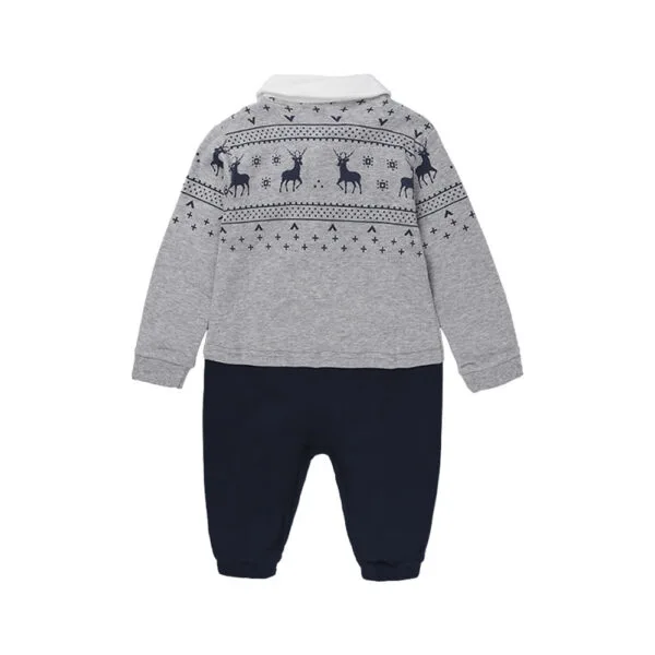 Φορμάκι ολόσωμο βρεφικό με κουμπάκια βεραμάν με Ταράνδους γκρι και γκρι λεπτομέρειες στο τελείωμα.