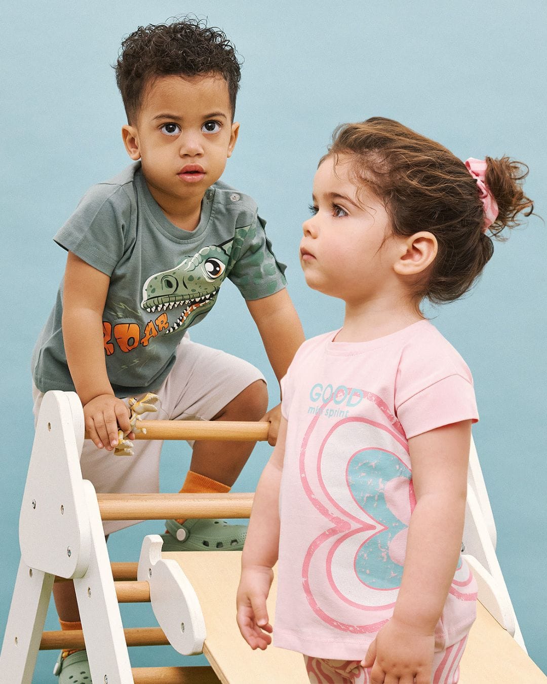 Σετ – Μπλούζα λευκή με δεινοσαύρους και σορτς μπεζ με ζώνη